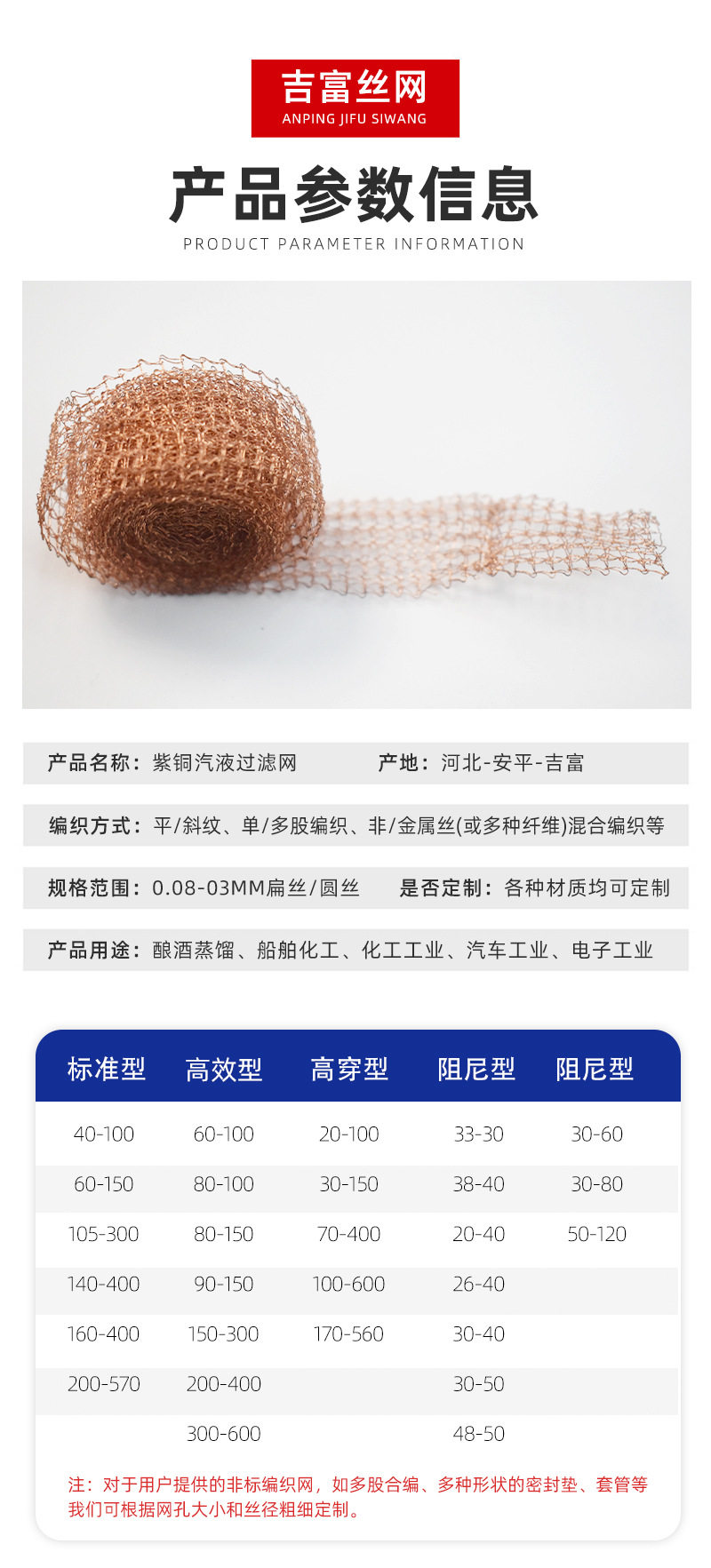 Copper Steam Liquid Separation Mesh Conductive Thermal Conductive Multi-Strand Plain Knitting Mesh Copper Wire Solid Liquid Wire Mesh Foam Remover Filter Mesh