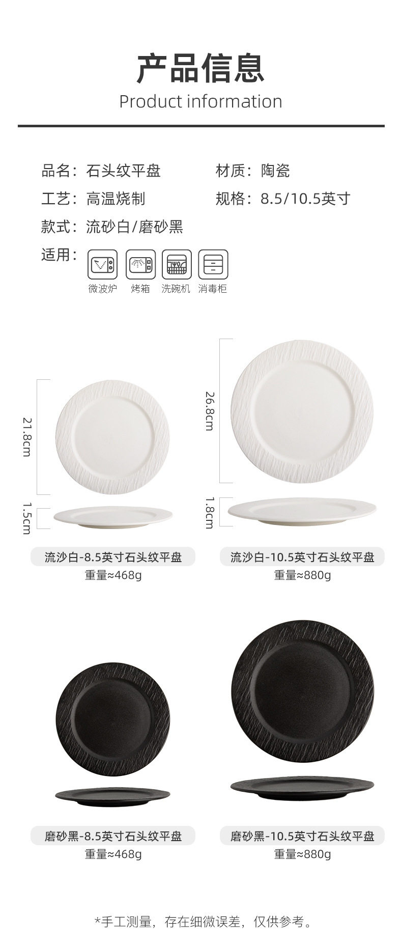 | Color | Quicksand white -8.5 inch stone grain flat plate/length 21.8cm,Frosted Black -8.5 "Stone Grain Flat Disc/Length 21.8cm,quicksand white -10.5 inch stone grain flat plate/length 26.8cm,Frosted Black -10.5 "Stone Grain Flat Disc/Length 26.8cm |