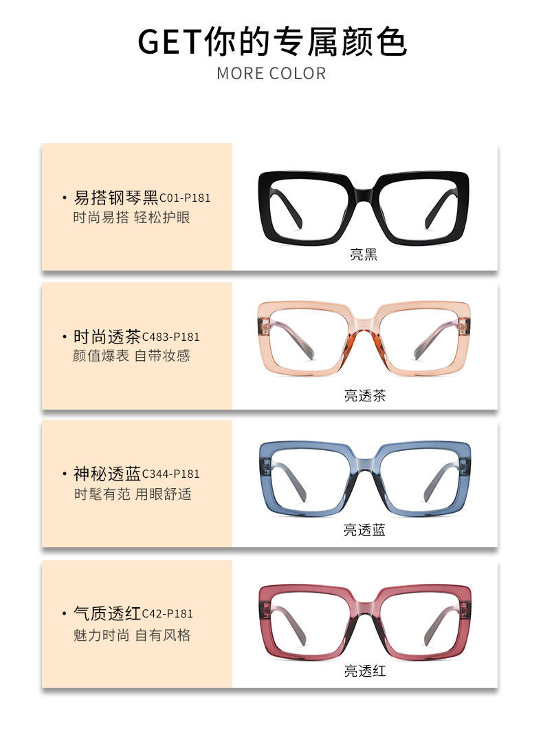 | Frame color | Bright Black C01-P181,Bright tea C483-P181,Bright blue C344-P181,Bright red C42-P181 |