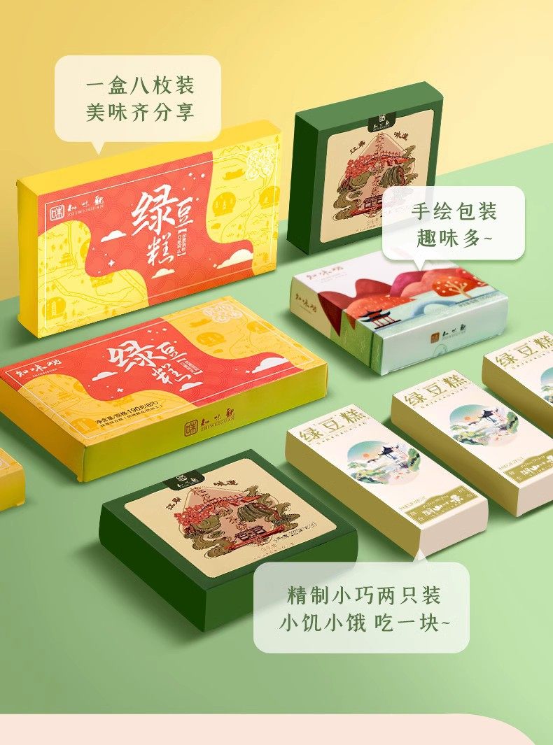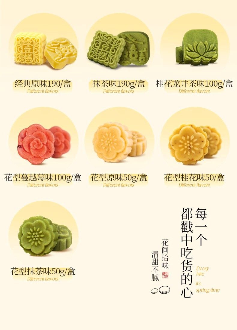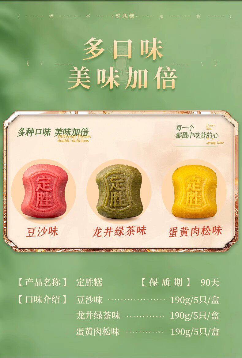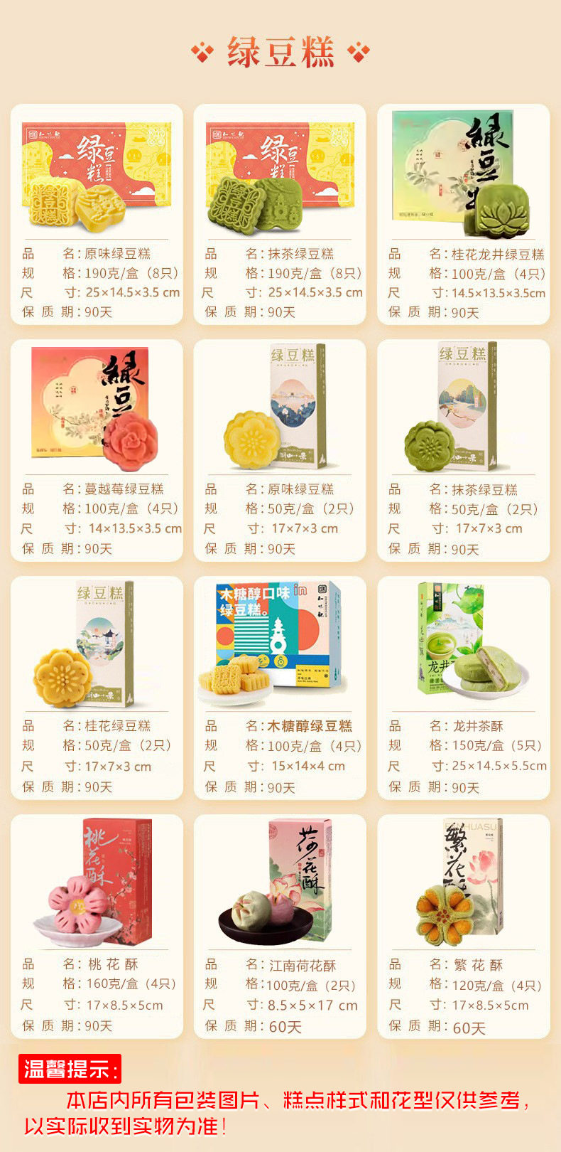 | Packaging specifications | 50g original mung bean cake 2 pack,50g matcha flavored mung bean cake 2 pack,50g osmanthus flavored mung bean cake 2 pack,100g mung bean cake osmanthus longjing tea 4 pack,100g mung bean cake cranberry flavor 4 pieces,100g mung bean cake xylitol 4 pieces,152g dingsheng cake (bean paste),152g dingsheng cake (egg yolk and meat floss),152g dingsheng cake (longjing green tea),160g mahogany cream flavor (pack of 4),160g peach blossom cake hawthorn flavor (pack of 4) |