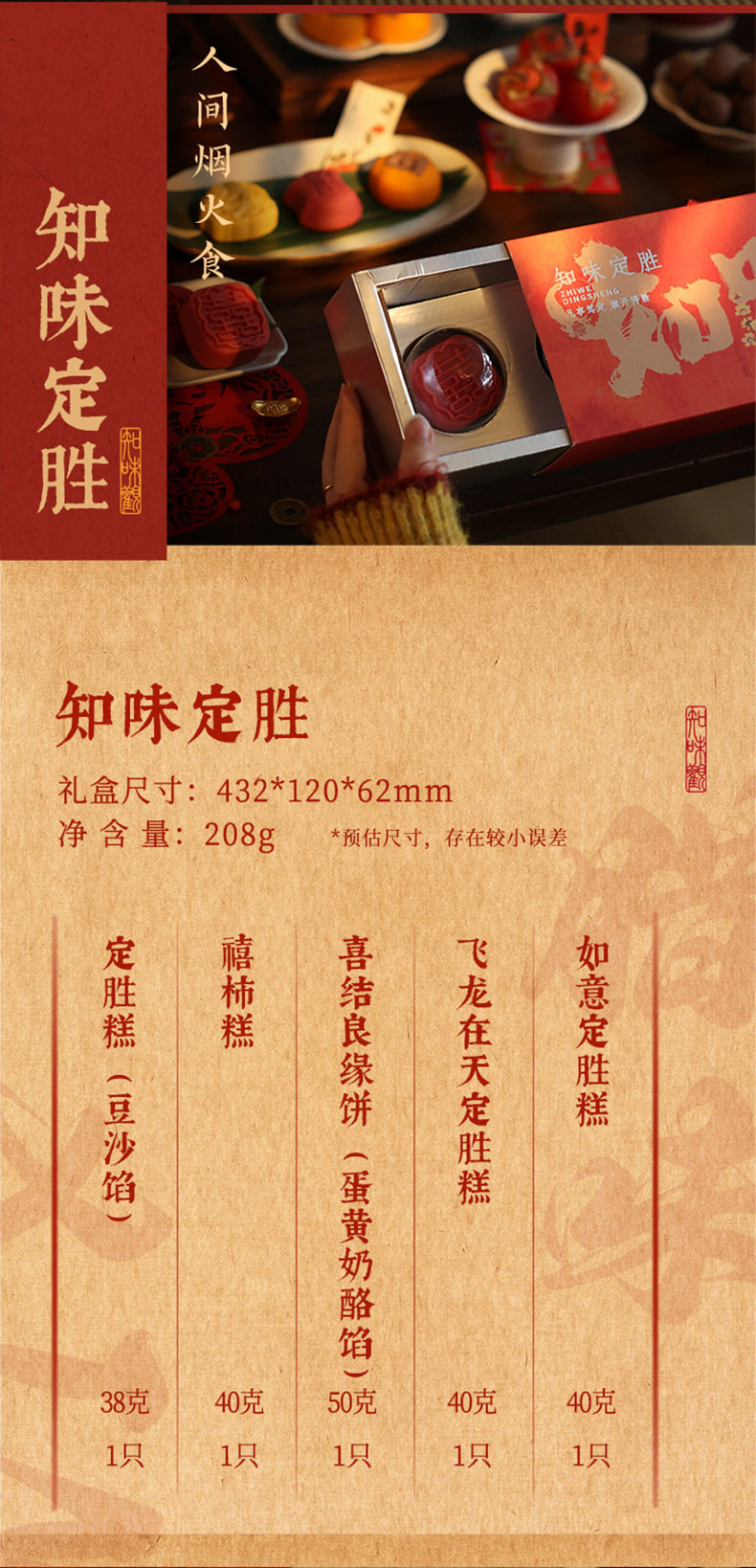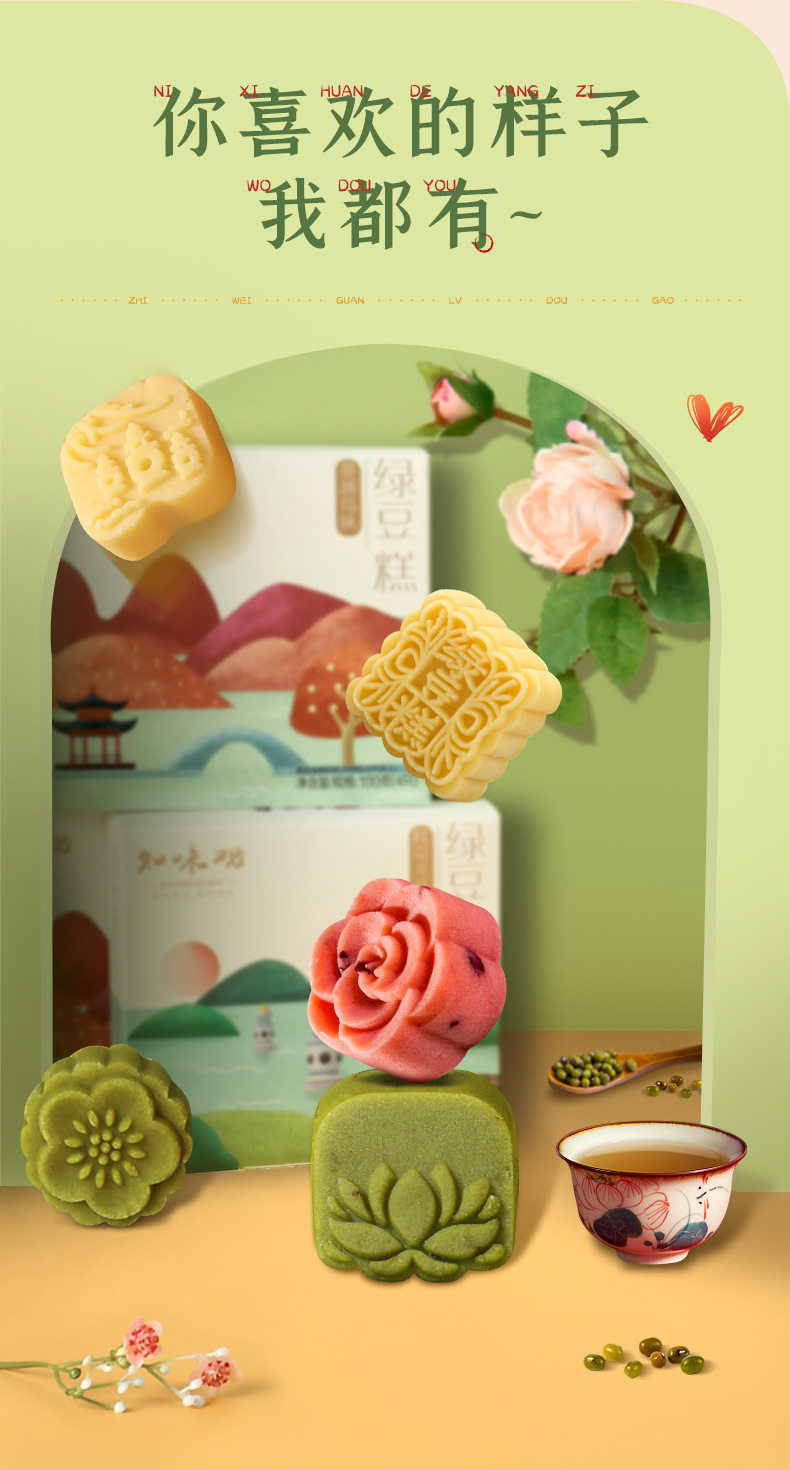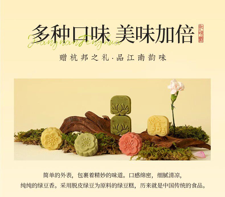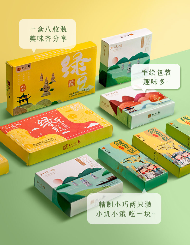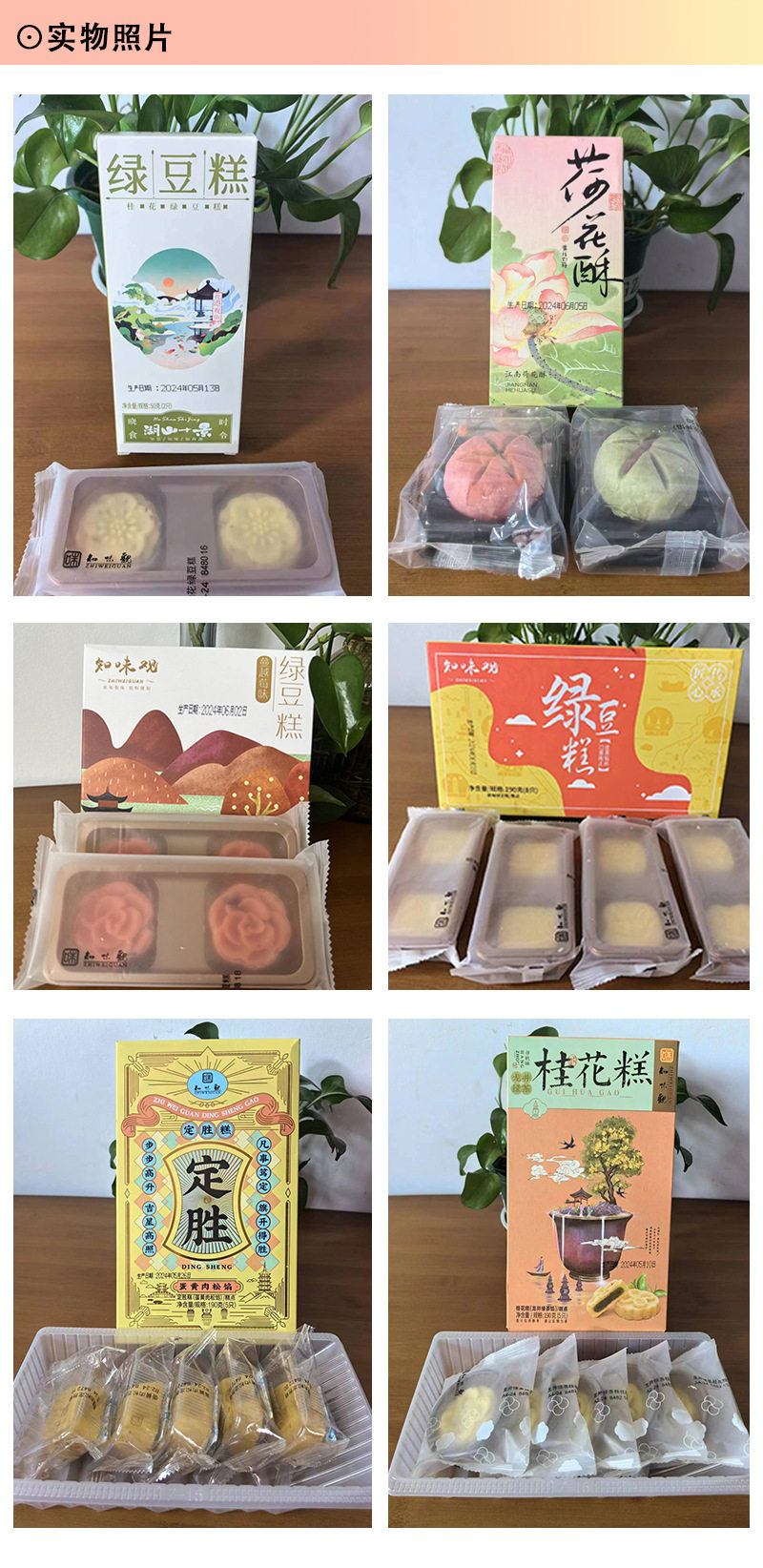 | Packaging specifications | 50g original mung bean cake 2 pack,50g matcha flavored mung bean cake 2 pack,50g osmanthus flavored mung bean cake 2 pack,100g mung bean cake osmanthus longjing tea 4 pack,100g mung bean cake cranberry flavor 4 pieces,100g mung bean cake xylitol 4 pieces,152g dingsheng cake (bean paste),152g dingsheng cake (egg yolk and meat floss),152g dingsheng cake (longjing green tea),160g mahogany cream flavor (pack of 4),160g peach blossom cake hawthorn flavor (pack of 4) |