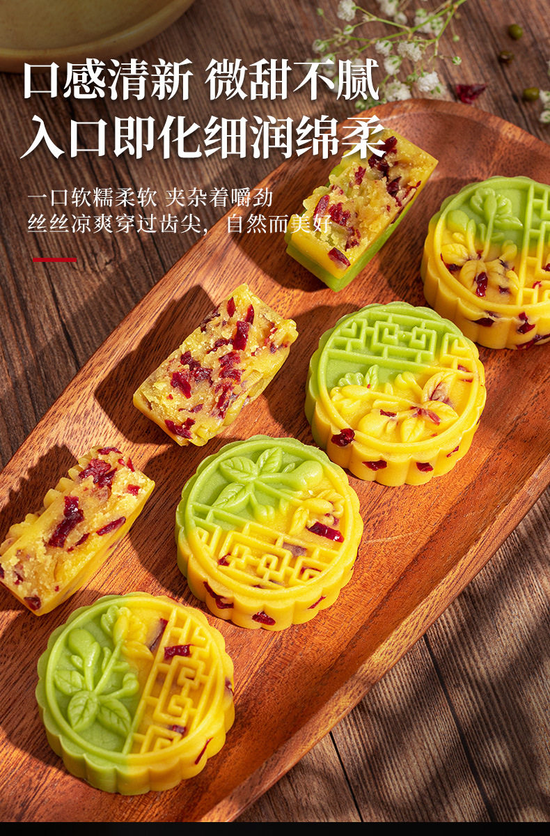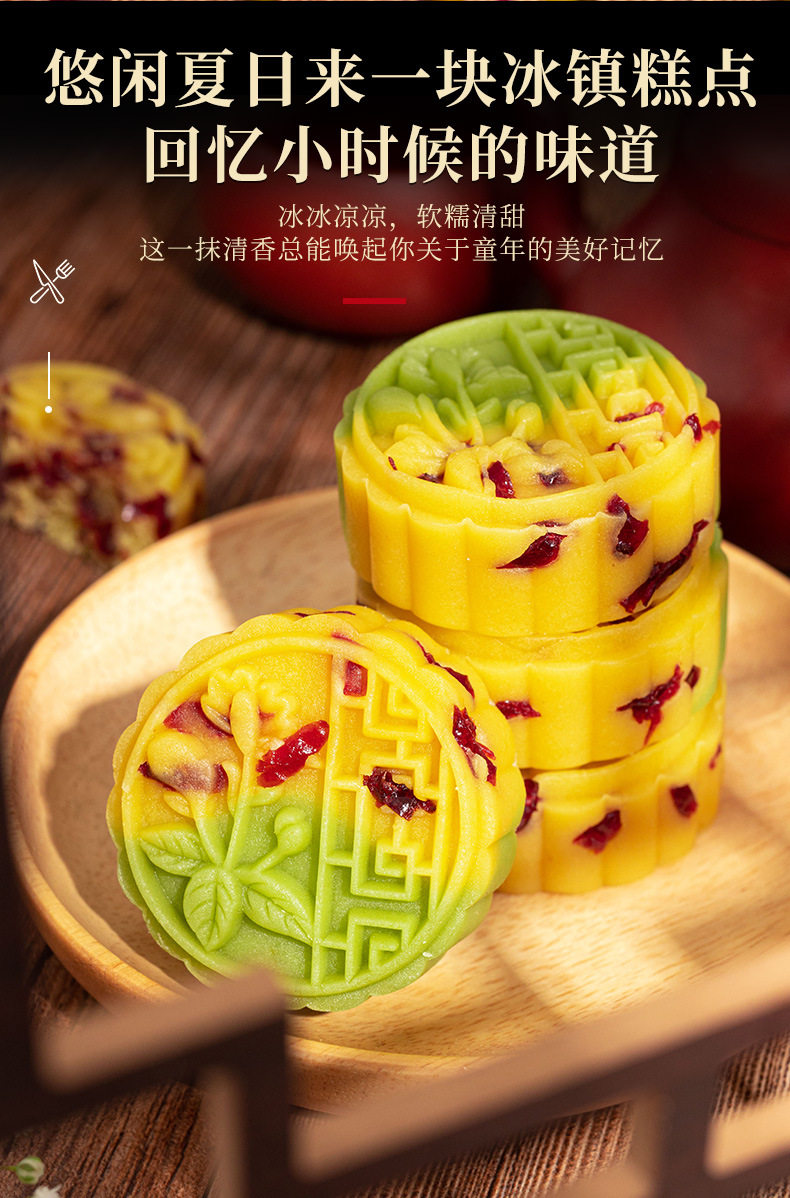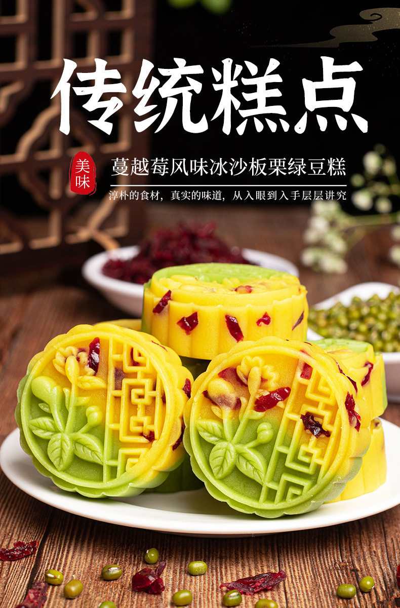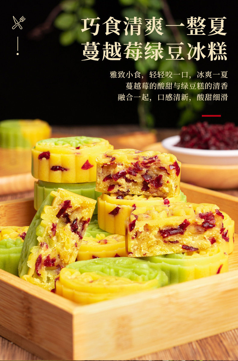 | Packaging specifications | Cranberry two-color mung bean cake 500 g/box,Cranberry two-color mung bean cake 1000 g/box,Cranberry two-color mung bean cake 500 g/box * 3,Cranberry two-color mung bean cake 1000 g/box * 2 |