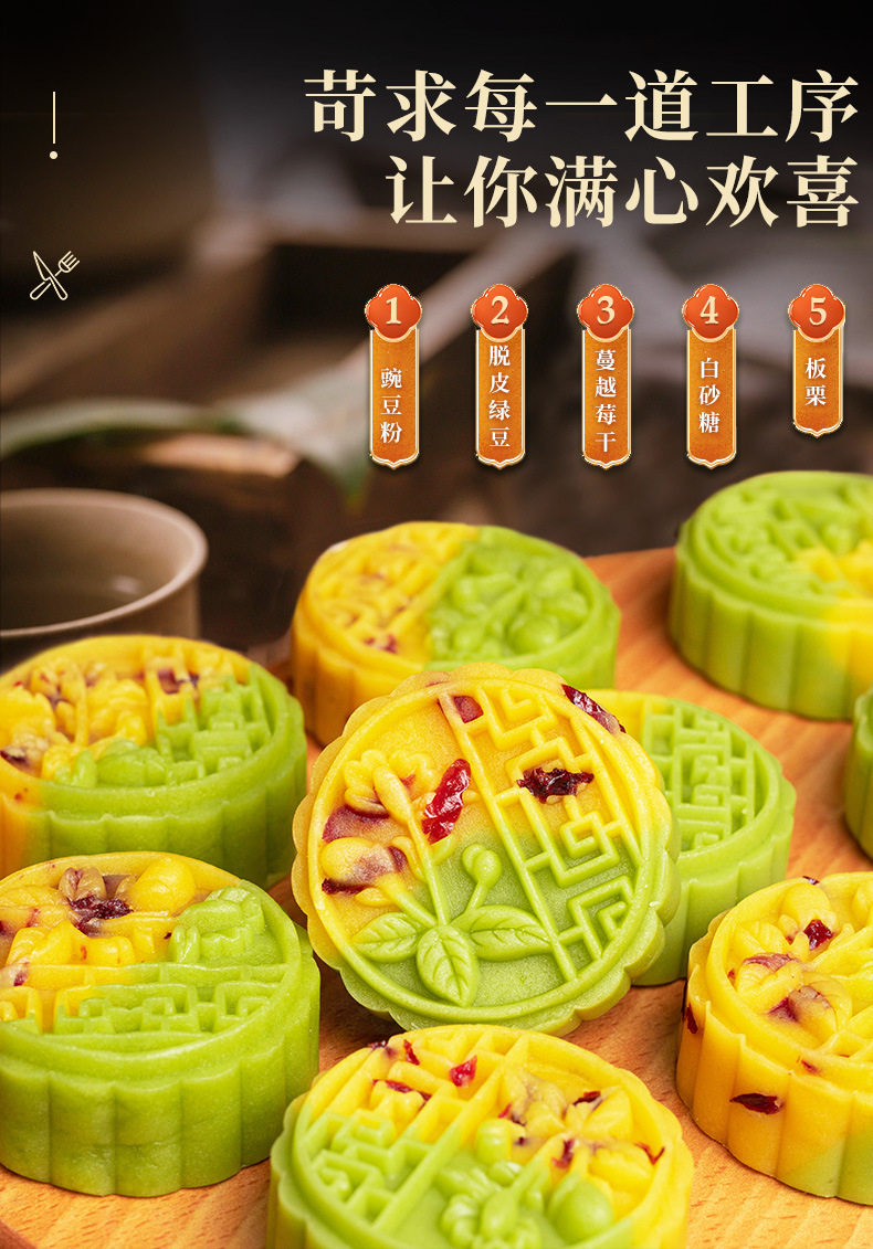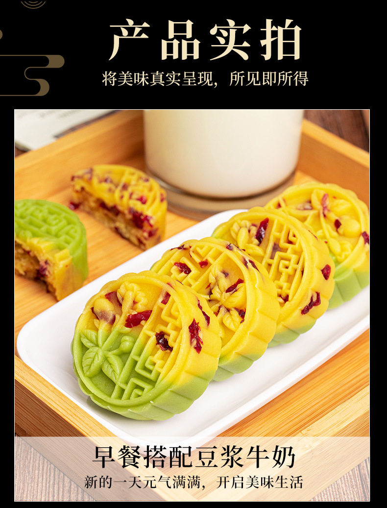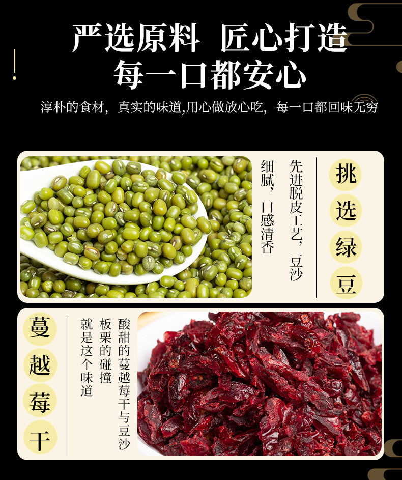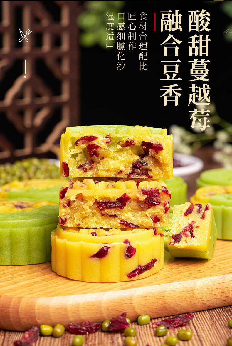 | Packaging specifications | Cranberry two-color mung bean cake 500 g/box,Cranberry two-color mung bean cake 1000 g/box,Cranberry two-color mung bean cake 500 g/box * 3,Cranberry two-color mung bean cake 1000 g/box * 2 |