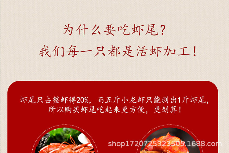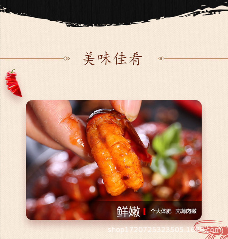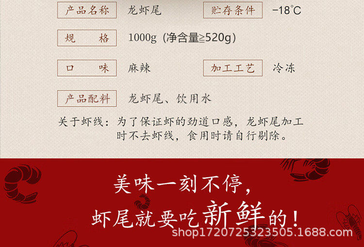| Packaging specifications | Special lobster tail 95 pieces 0.5kg [6~ 8cm long] feeding package,First-class lobster tail, about 120 pieces 0.5kg [5~ 6cm long] feeding package,Secondary lobster tail 150 pieces 0.5kg [4~ 5cm long] feeding package |