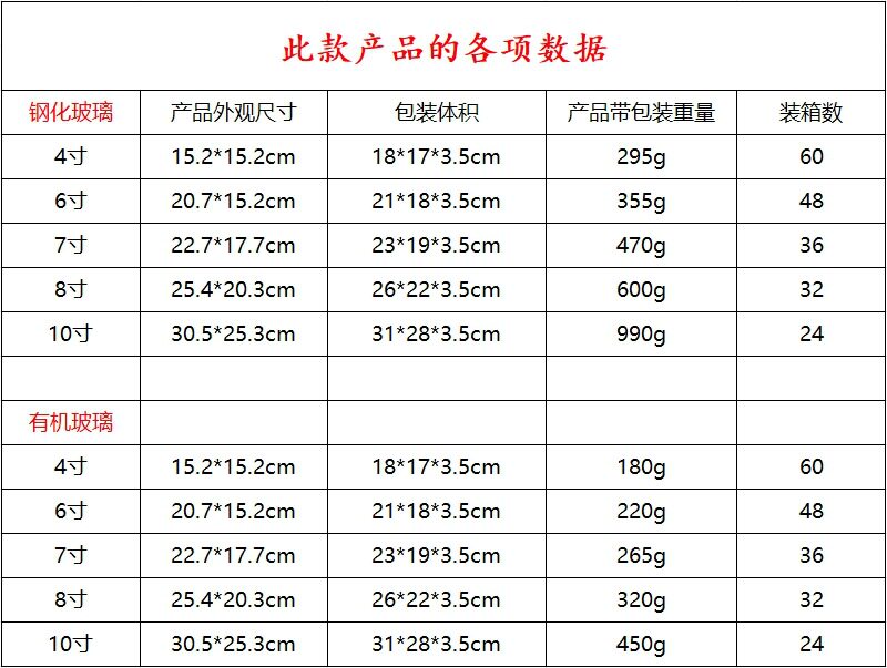 | Inner frame size | 4inch table setting (individually packaged),6inch table setting (individually packaged),7inch table setting (individually packaged),8inch table setting (individually packaged),10inch table setting (individually packaged),467inch set (three sizes in one box),8inch 3-piece set (three 8inch pieces in one packaging box),10inch 3-piece set (three 10inch pieces in one packaging box) |