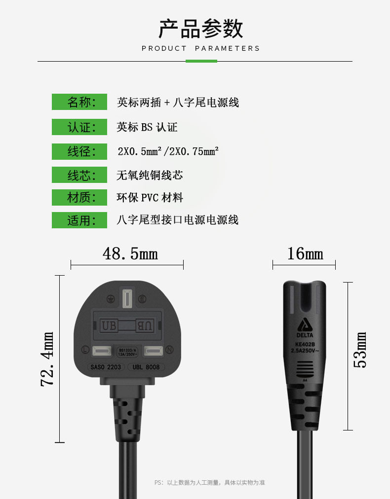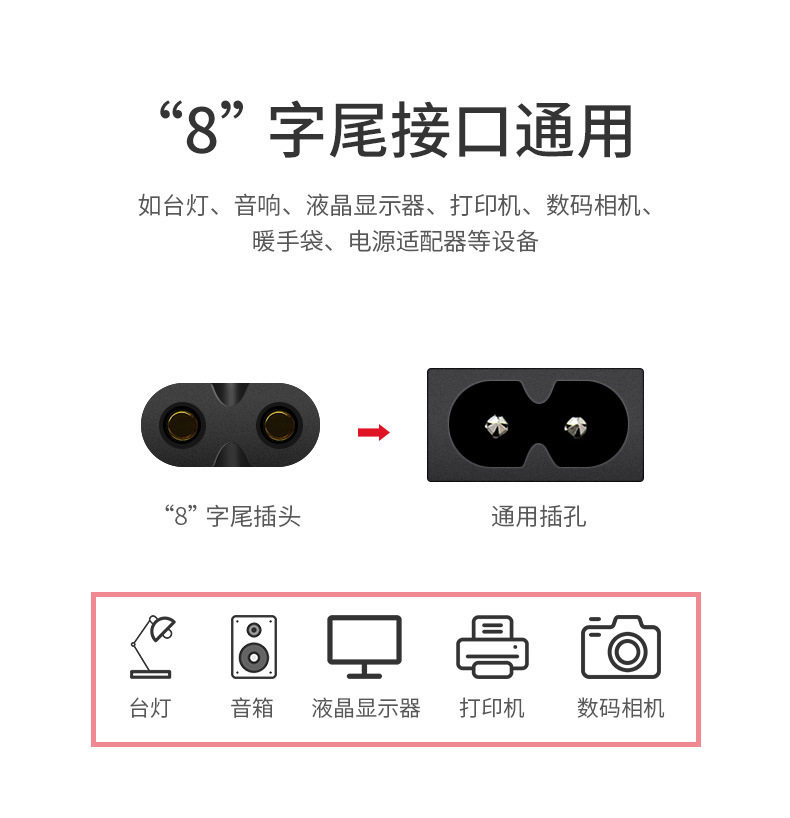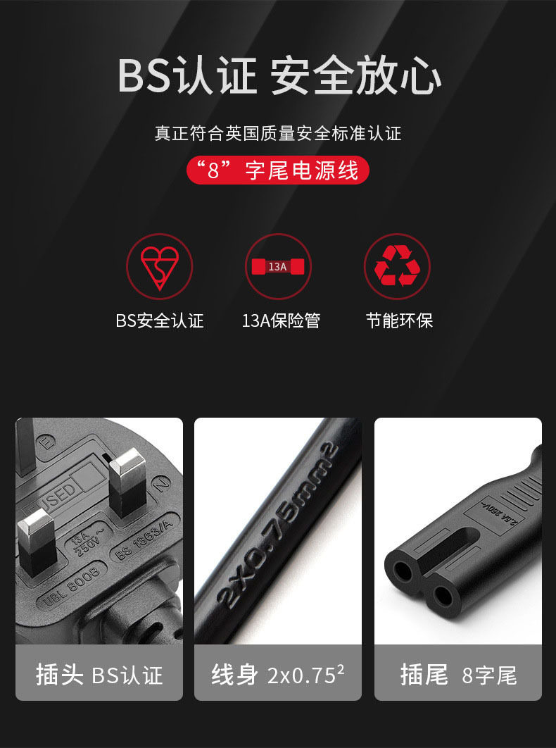 Bs Certified Pure Copper British Standard Cable Saudi Three-Plug 8-Character Tail British Standard Monitor Adapter Power Cord White