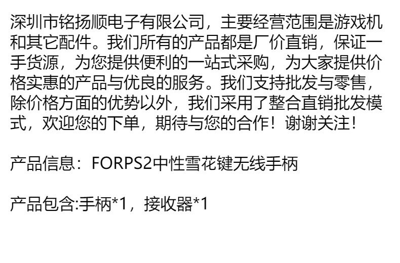 | Product color | PS2 neutral snowflake key wireless handle-Black,PS2 neutral snowflake key wireless handle-Blue,PS2 neutral snowflake key wireless handle-light green,PS2 neutral snowflake key wireless handle-Red,PS2 neutral snowflake key wireless handle-White,PS2 neutral snowflake key wireless handle-purple |
