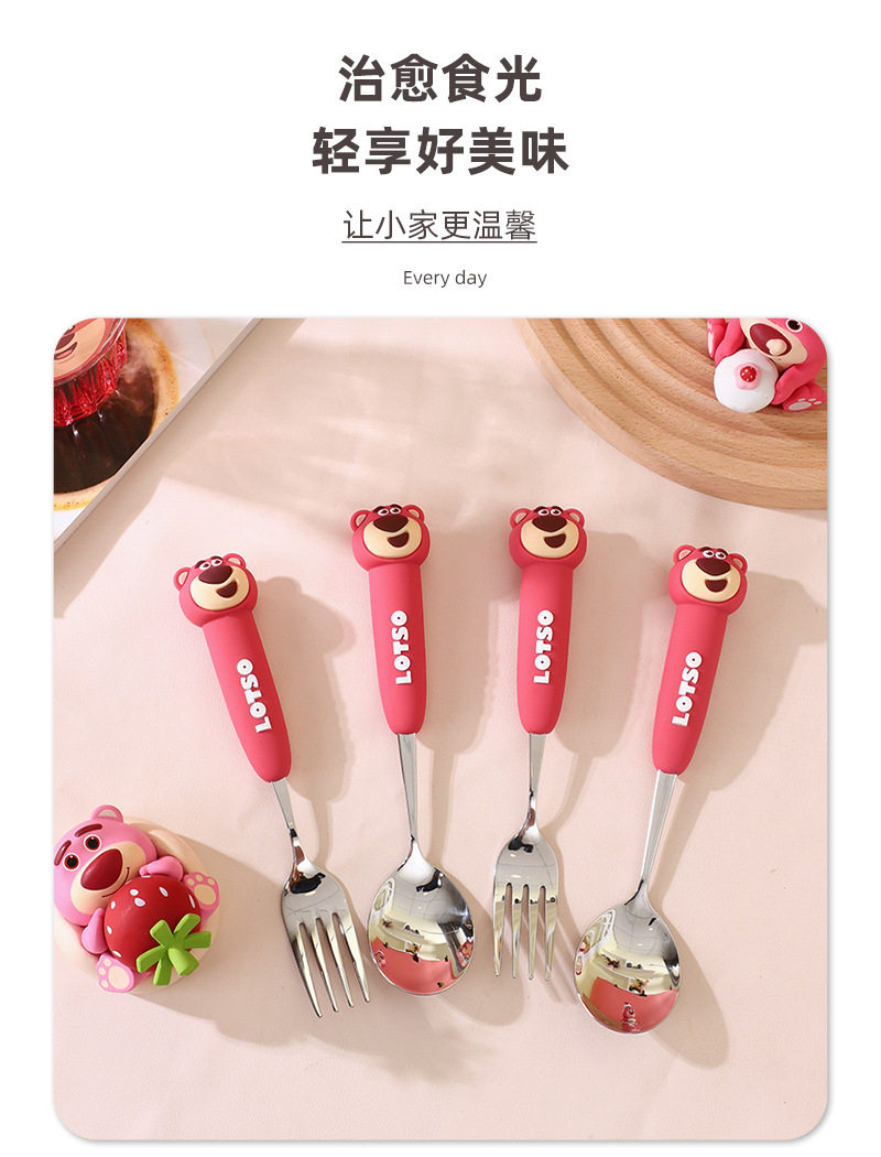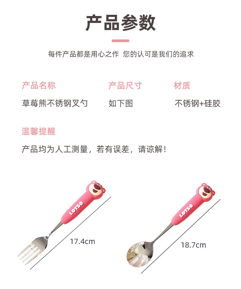 | Color | Strawberry bear 304 stainless steel spoon,Strawberry bear 304 stainless steel fork,Strawberry bear 304 stainless steel spoon and fork pair,Pooh 304 stainless steel ladle,Pooh 304 stainless steel fork,Pooh 304 stainless steel spoon and fork pair,Stitch 304 stainless steel spoon,Stitch 304 stainless steel fork,A pair of stitch 304 stainless steel spoons and forks |