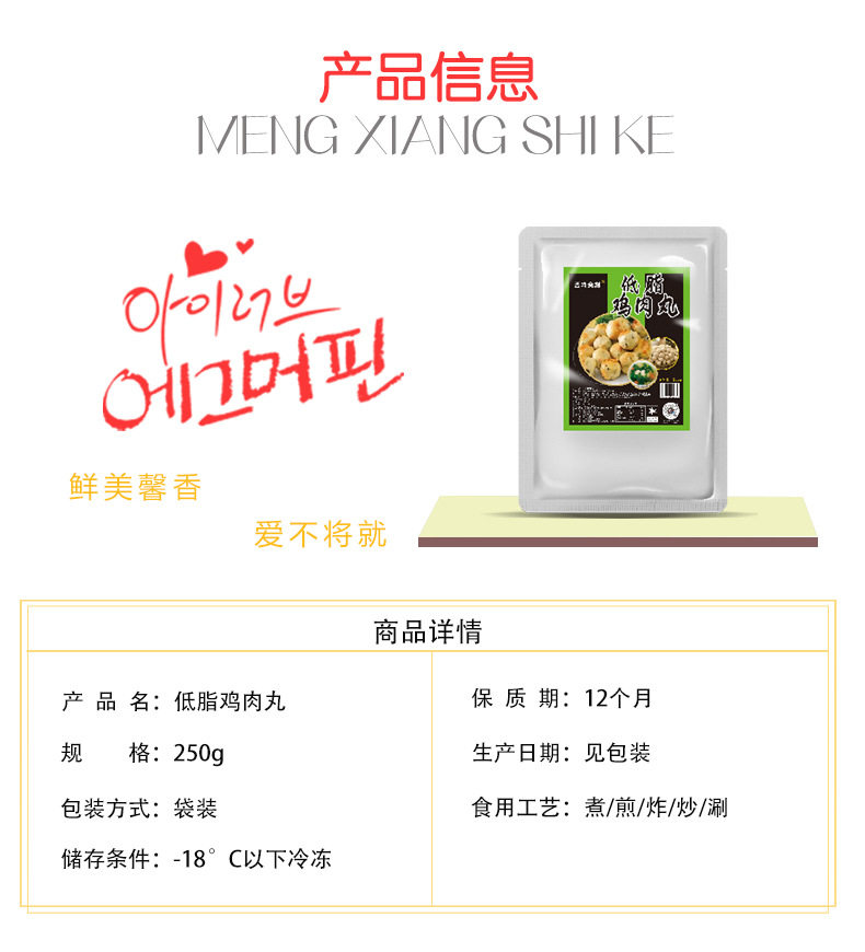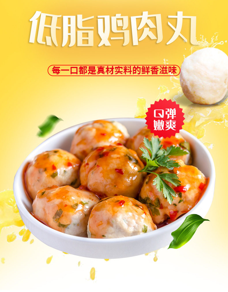 | Packaging specifications | Low-fat chicken sticks 250g,Low-fat chicken meatballs 250g |