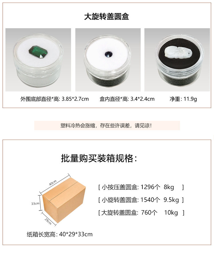 | Specifications | Small rotating screw cap round box,Large rotating screw cap round box,Small press lid round box |