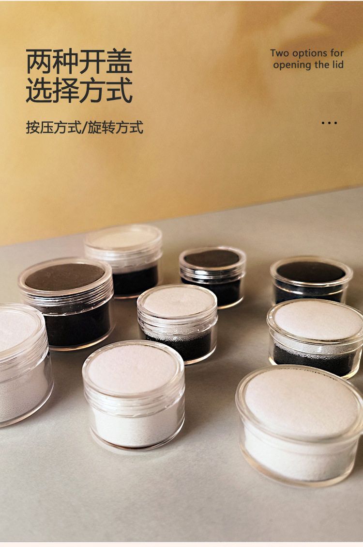 | Specification model | One layer each of black and white cotton; small round box with a press-down lid,One layer each of black and white cotton; small twist-cap round container,One layer each of black and white cotton; large twist-cap round container,White 2-layer cotton; small press cover round box,White 2-layer cotton; small rotating twist-cap round box,White 2-layer cotton; large rotating twist-cap round box,Black 2-layer cotton; small press cover round box,Black 2-layer cotton; small rotating twist-cap round box,Black 2-layer cotton; large rotating twist-cap round box |