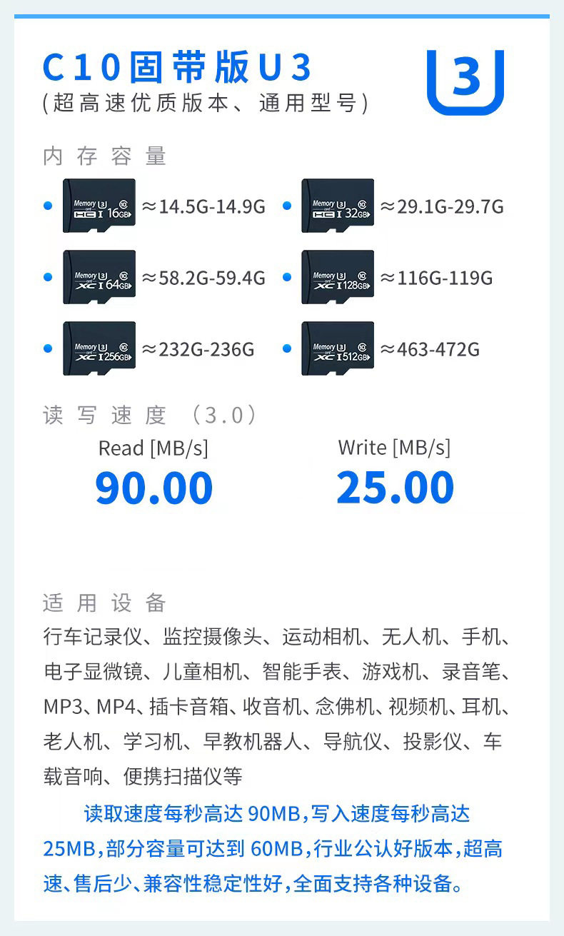 | Capacity | 128MB,1G,2GB,4GB-U3,8GB-U3,16GB-U3,32GB-U3,64GB-U3,128GB-U3,256GB-U3,512GB-U3 |