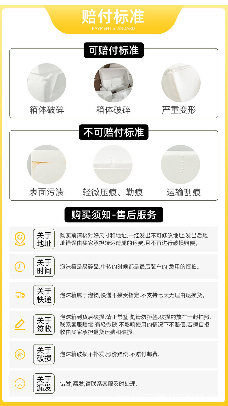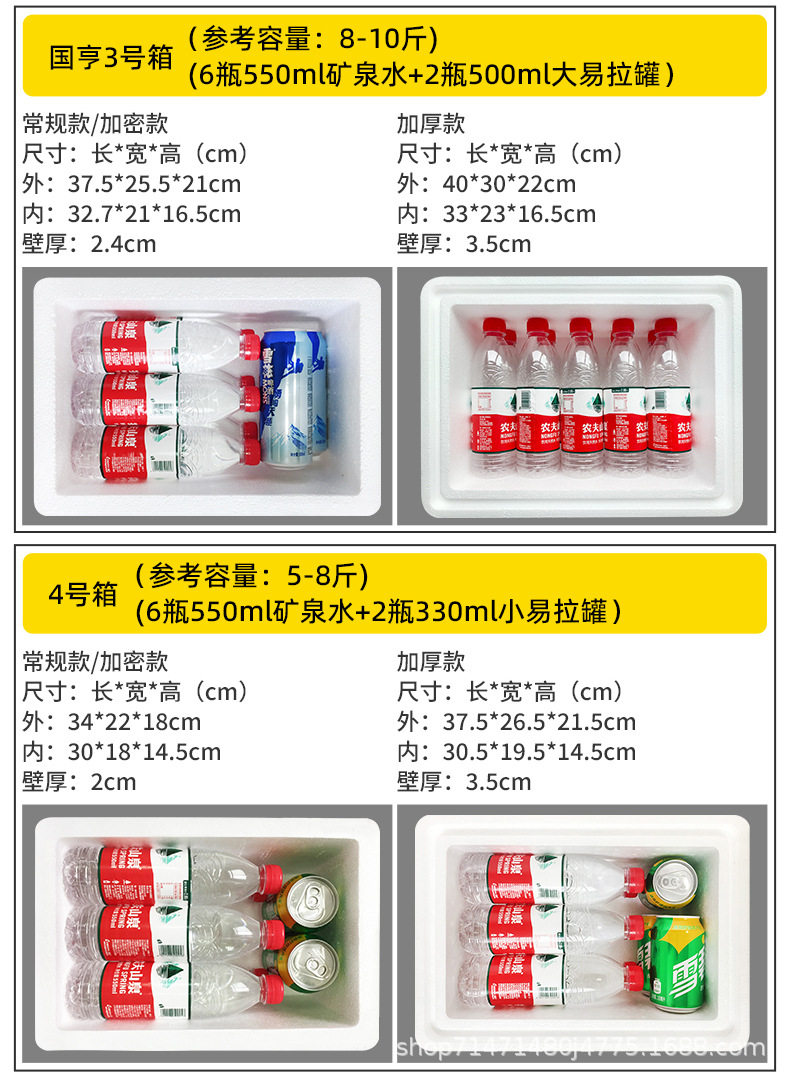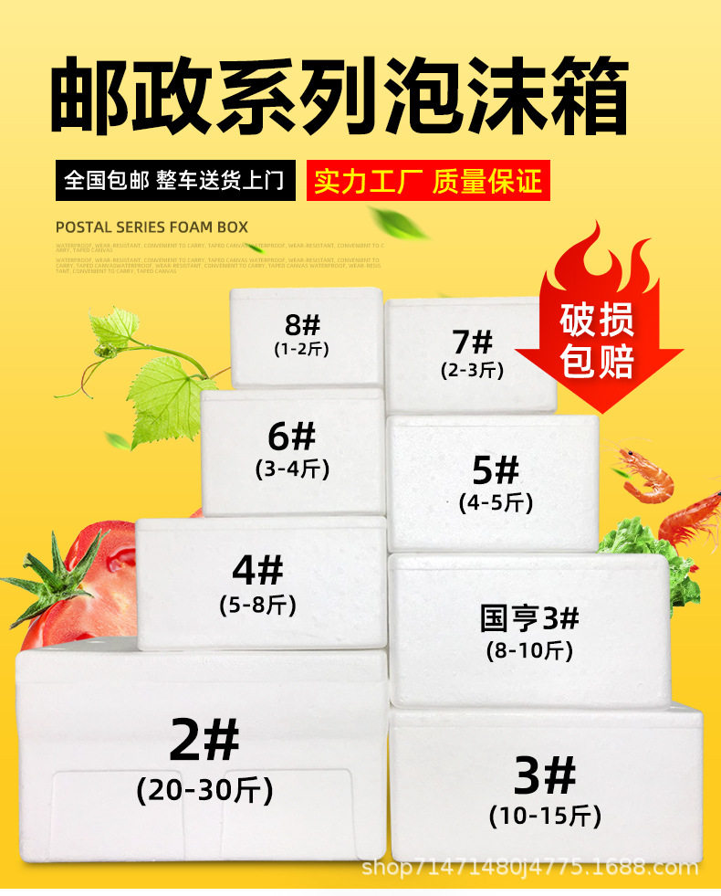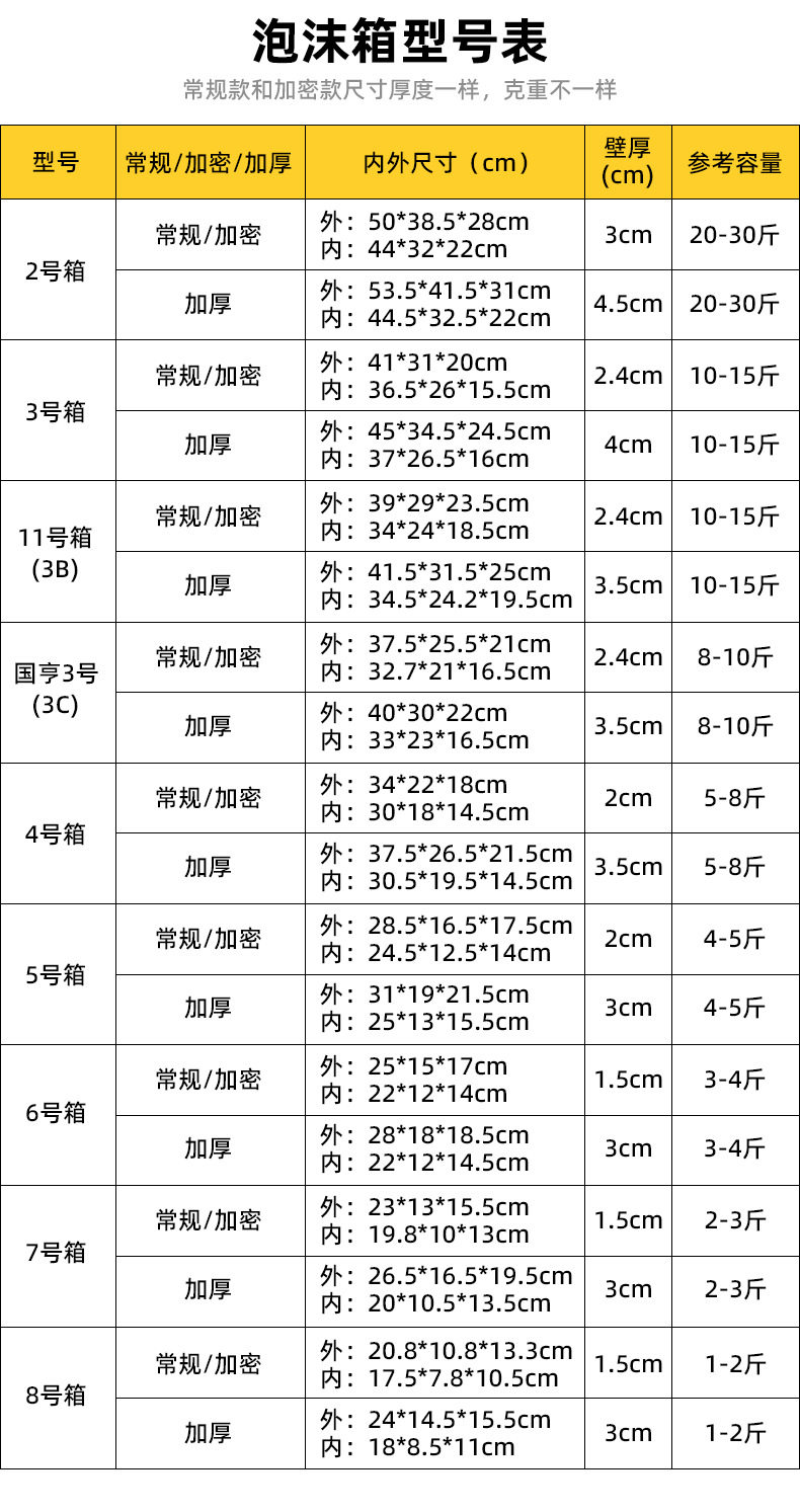 | Specifications and models | No. 2 [multiple of 3]],No. 3 [multiple of 6]],3B [Multiple of 9]],Guoheng No.3 [Multiple of 9]],No. 4 [multiple of 16]],No.5 [multiple of 12]],No. 6 [multiple of 18]],No. 7 [multiple of 40]],No. 8 [multiple of 50]],High Density No.3 [Multiple of 6]],High Density No. 4 [Multiple of Shot 16]],High Density No.5 [Multiple of 12]],High Density No.6 [Multiple of Shot 18]],High Density No.7 [Multiple of 40]],High Density No.8 [Multiple of 50]],Gaomi Guoheng No.3 [Multiple of 9]],Thickened foam box reference 40kg [multiple of 1]],Thickened 20kg [multiple of 1]],Thicken No. 2 [multiple of 3]],Thickened No. 3 [multiple of 6]],Thickened No. 4 [multiples of 16]],Thickened No. 5 [multiple of 12]],Thickened No. 6 [multiple of 18]],Thickened No.7 [Multiple of 40]],Thickened No. 8 [multiples of 50]],No. 2 foam carton [multiples of 3]],3B foam carton [multiple of 9]],Guoheng No.3 Foam Carton [Multiples of 9]],No. 4 foam carton [multiples of 16]],No.5 foam carton [multiples of 12]],No. 6 foam carton [multiples of 18]],No. 7 foam carton [multiples of 40]],No. 8 foam carton [multiples of 50]],No. 3 foam carton [multiple of 3]],Thickened small square box 10kg [take a multiple of 3,Narrow 4 [multiple of 12]],280 low square box [multiple of 16]],280 high square box [multiple of 12]],Non-standard No. 5 [multiple of 12]],No. 5.5 [multiple of 16]],240 low square box [multiple of 20]],240 high square box [multiple of 20]] |