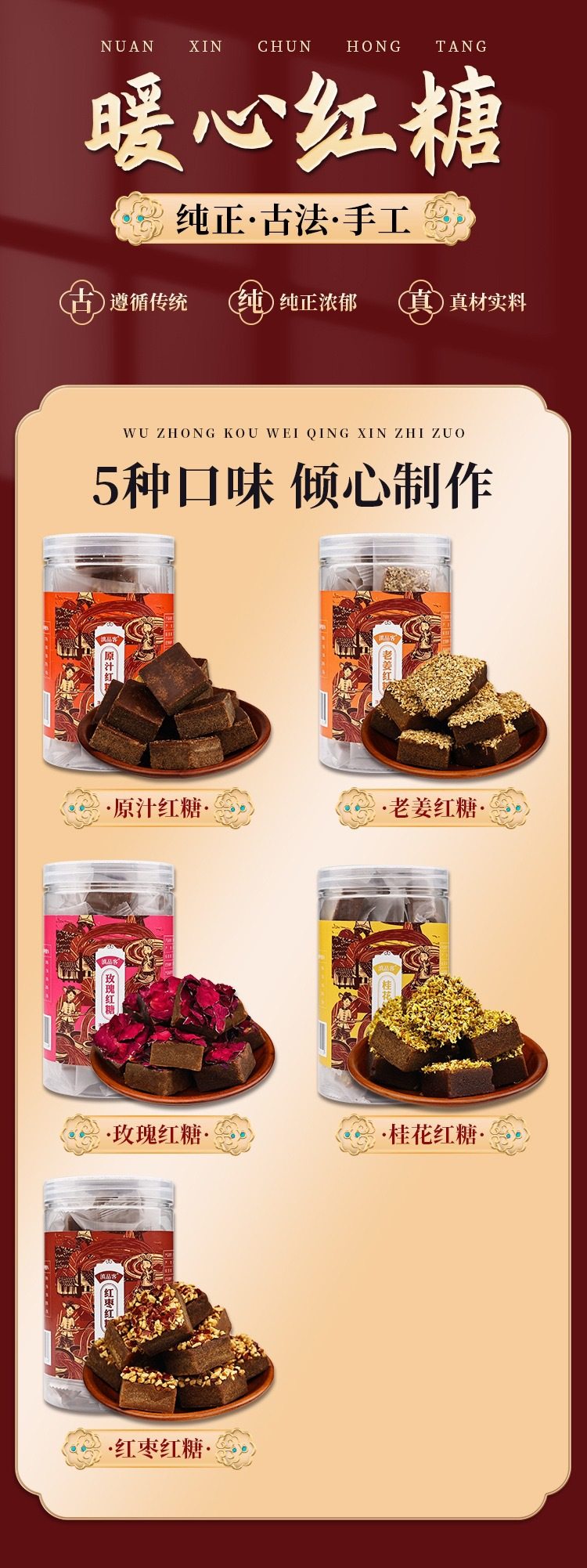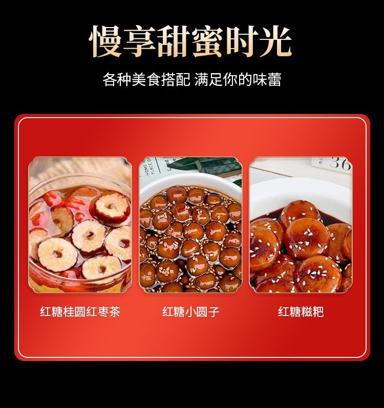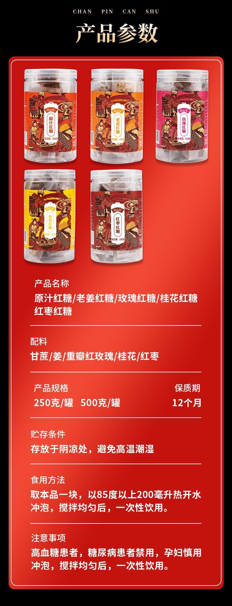 | Packaging specifications | Osmanthus brown sugar 250g * 1 can,Red date brown sugar 250g * 1 can,Rose Brown sugar 250g * 1 can,Raw brown sugar 250g * 1 can,Ginger Brown sugar 250g * 1 can,Osmanthus brown sugar 250g * 2 cans,Red date brown sugar 250g * 2 cans,Rose Brown sugar 250g * 2 cans,Raw brown sugar 250g * 2 cans,Ginger Brown sugar 250g * 2 cans,Five flavors each can,Raw brown sugar 500g * 1 can,Raw brown sugar 500g * 2 cans,Raw brown sugar 500g * 3 cans,Raw brown sugar 500g * 5 cans |