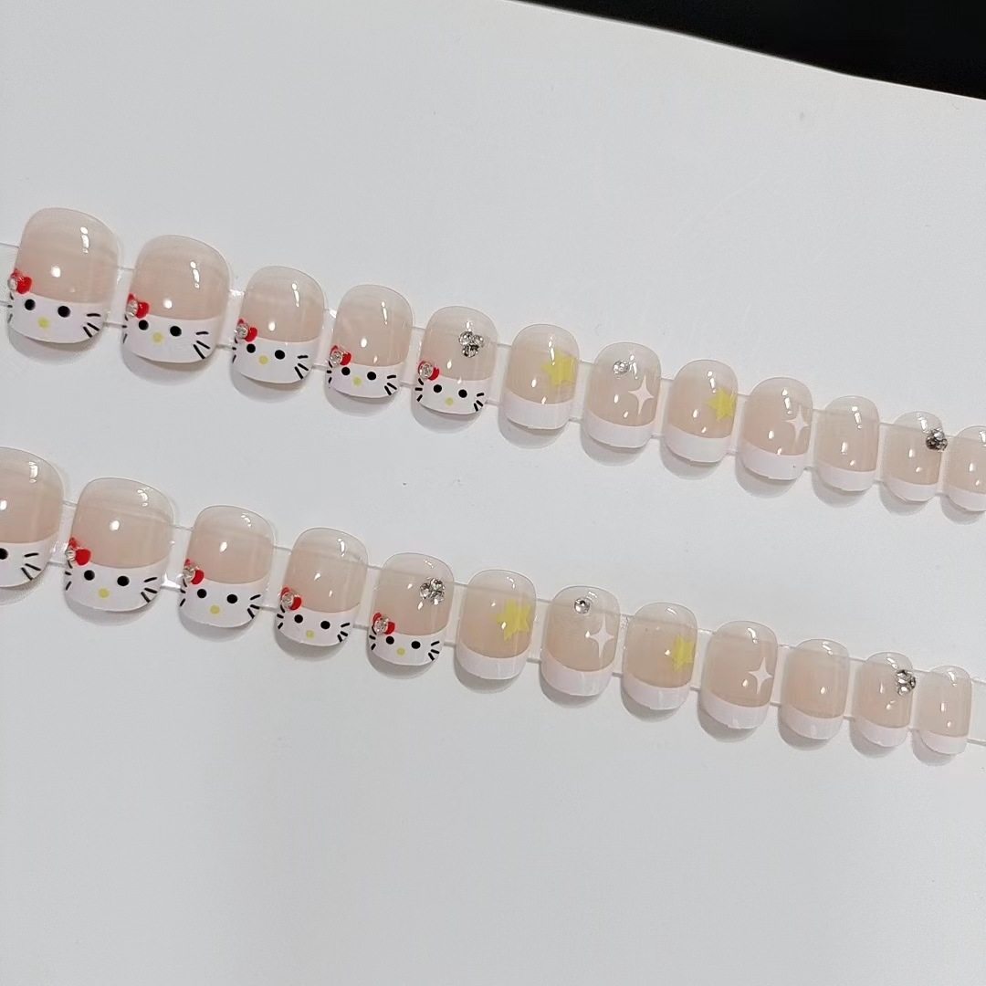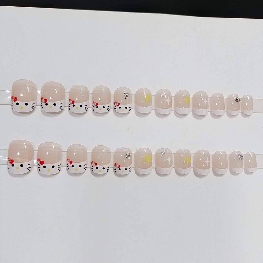 B665Kt Cat Fresh Cute Girl Wear Armor Short Cartoon Small Diamond Student Daily Manicure Fake Nail Tablets