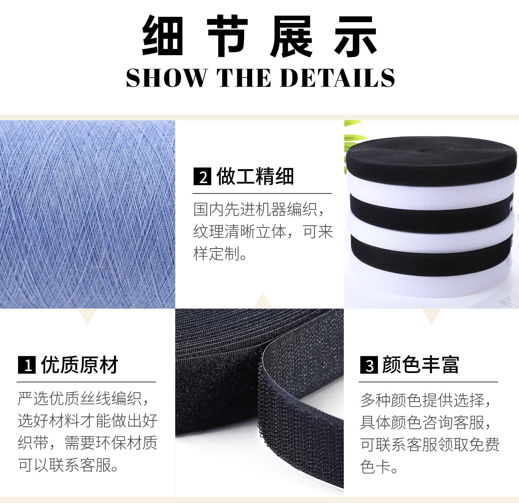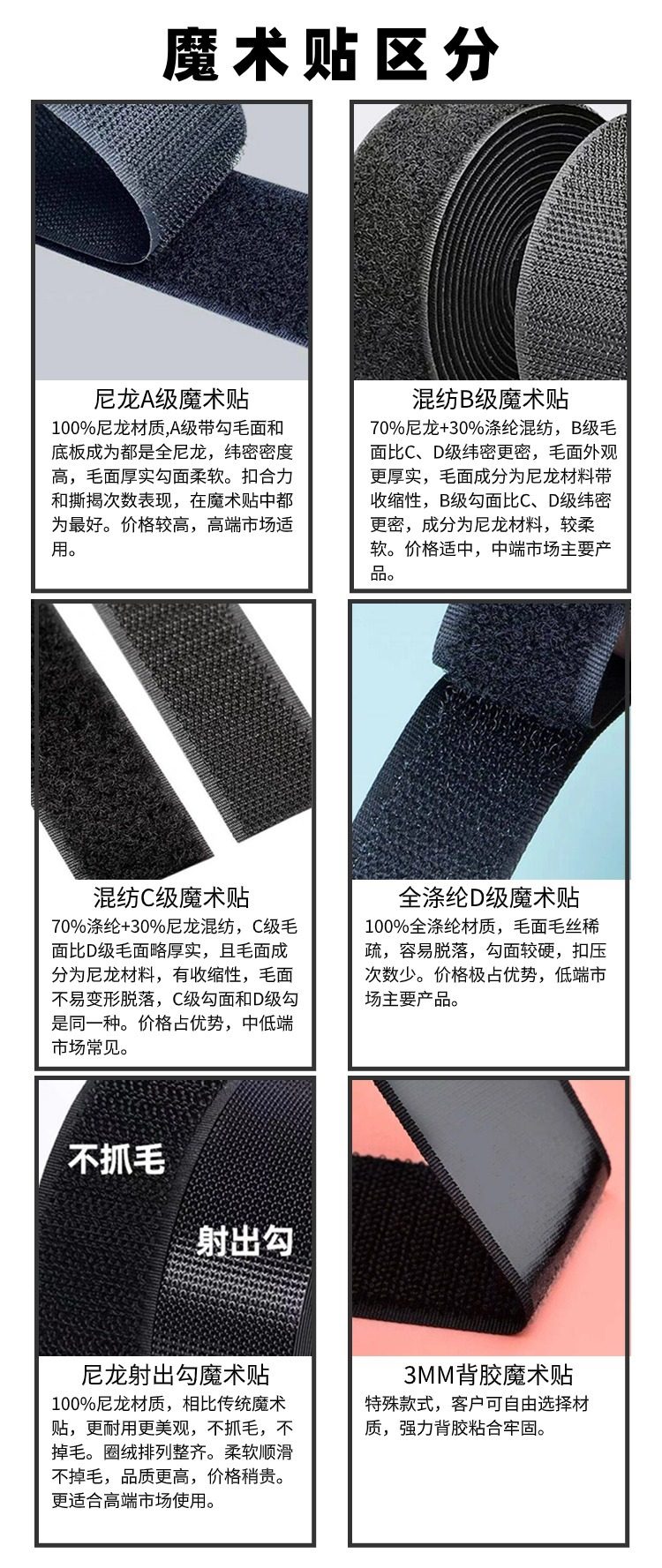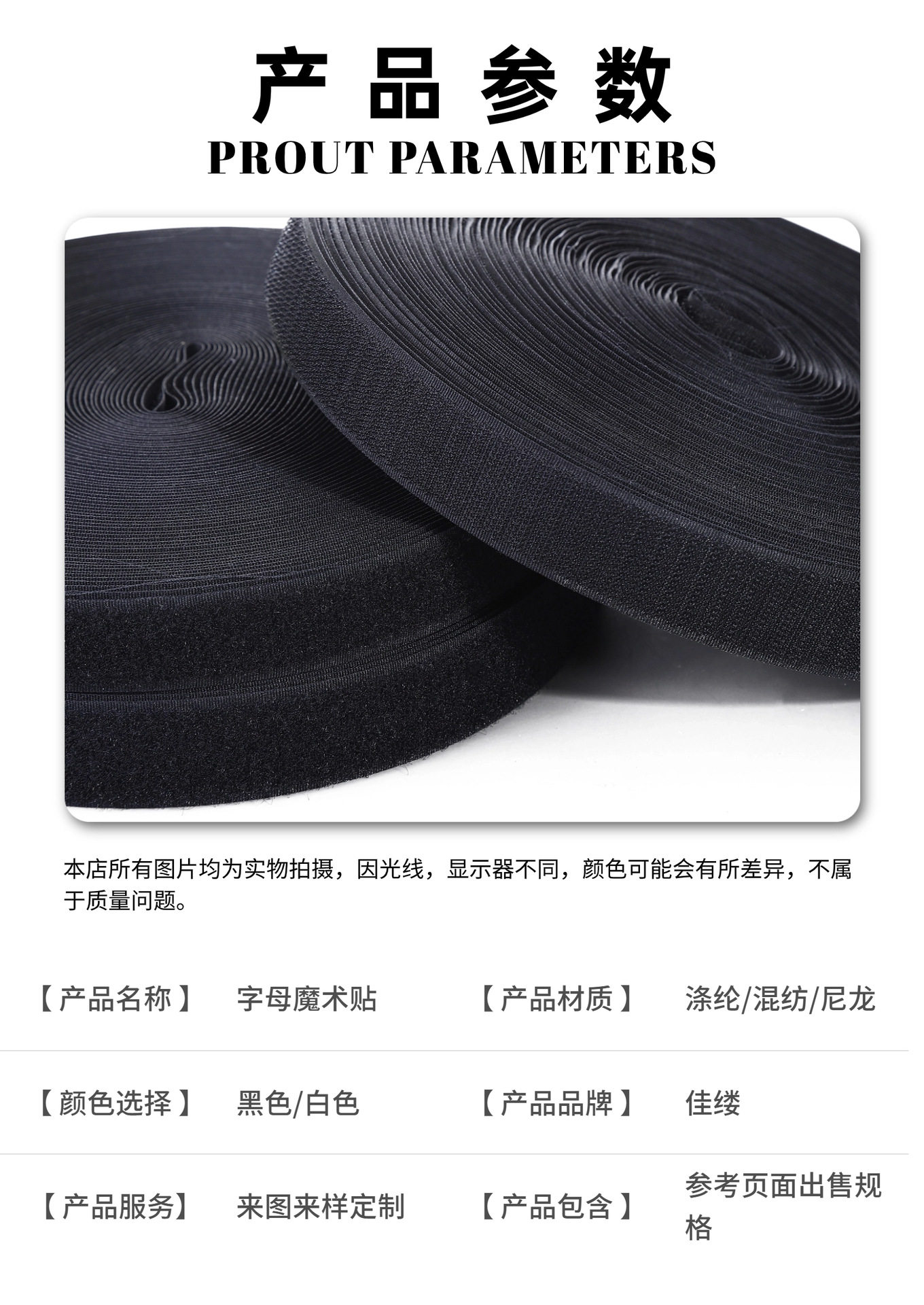 | Specifications and models | Black polyester 1.6CM [hook surface]],Black polyester 1.6CM [wool]],Black polyester 2CM [hook surface]],Black polyester 2CM [wool]],Black polyester 2.5CM [hook surface]],Black polyester 2.5CM [wool]],Black polyester 3CM [hook surface]],Black polyester 3CM [wool]],Black polyester 3.8CM [hook surface]],Black polyester 3.8CM [wool]],Black polyester 5CM [hook surface]],Black polyester 5CM [wool]],Black polyester 10CM [hook surface]],Black polyester 10CM [wool]],Black polyester 11CM [hook surface]],Black polyester 11CM [wool]],White polyester 2CM [hook surface]],White polyester 2CM [wool]],White polyester 2.5CM [hook surface]],White polyester 2.5CM [wool]],White polyester 3CM [hook surface]],White polyester 3CM [wool]],White polyester 3.8CM [hook surface]],White polyester 3.8CM [wool]],White polyester 5CM [hook surface]],White polyester 5CM [wool]],White polyester 10CM [hook surface]],White polyester 10CM [wool]],White polyester 11CM [hook surface]],White polyester 11CM [wool]],Black ordinary 1.6CM [hook surface]],Black ordinary 1.6CM [wool]],Black ordinary 2CM [hook surface]],Black ordinary 2CM [wool]],Black ordinary 2.5CM [hook surface]],Black ordinary 2.5CM [wool]],Black ordinary 3CM [hook surface]],Black ordinary 3CM [wool]],Black ordinary 3.8CM [hook surface]],Black ordinary 3.8CM [wool]],Black ordinary 5CM [hook surface]],Black ordinary 5CM [wool]],Black ordinary 6CM [hook surface]],Black ordinary 6CM [wool]],Black ordinary 7CM [hook surface]],Black ordinary 7CM [wool]],Black ordinary 8CM [hook surface]],Black ordinary 8CM [wool]],Black ordinary 10CM [hook surface]],Black ordinary 10CM [wool]],Black ordinary 11CM [hook surface]],Black ordinary 11CM [wool]],White ordinary 1.6CM [hook surface]],White ordinary 1.6CM [wool]],White ordinary 2CM [hook surface]],White ordinary 2CM [wool]],White ordinary 2.5CM [hook surface]],White ordinary 2.5CM [wool]],White ordinary 3CM [hook surface]],White ordinary 3CM [wool]],White ordinary 3.8CM [hook surface]],White ordinary 3.8CM [wool]],White ordinary 5CM [hook surface]],White ordinary 5CM [wool]],White ordinary 6CM [hook surface]],White ordinary 6CM [wool]],White ordinary 7CM [hook surface]],White ordinary 7CM [wool]],White ordinary 8CM [hook surface]],White ordinary 8CM [wool]],White ordinary 10CM [hook surface]],White ordinary 10CM [wool]],White ordinary 11CM [hook surface]],White ordinary 11CM [wool]],Black blended 1.6CM [hook surface]],Black blended 1.6CM [wool]],Black blended 2CM [hook surface]],Black blended 2CM [wool]],Black blended 2.5CM [hook surface]],Black blended 2.5CM [wool]],Black blended 3CM [hook surface]],Black blended 3CM [wool]],Black blended 3.8CM [hook]],Black blended 3.8CM [wool]],Black blended 5CM [hook surface]],Black blended 5CM [wool]],Black blended 10CM [hook surface]],Black blended 10CM [wool]],Black blended 11CM [hook]],Black blended 11CM [wool]],White blended 1.6CM [hook surface]],White blended 1.6CM [wool]],White blended 2CM [hook surface]],White blended 2CM [wool]],White blended 2.5CM [hook surface]],White blended 2.5CM [wool]],White blended 3CM [hook surface]],White blended 3CM [wool]],White blended 3.8CM [hook surface]],White blended 3.8CM [wool]],White blended 5CM [hook surface]],White blended 5CM [wool]],White blended 10CM [hook surface]],White blend 10CM rough edge,White blended 11CM [hook surface]],White blended 11CM [wool]],Black nylon 1.6CM [hook surface]],Black nylon 1.6CM [wool]],Black nylon 2CM [hook surface]],Black nylon 2CM [wool]],Black nylon 2.5CM [hook surface]],Black nylon 2.5CM [wool]],Black nylon 3CM [hook surface]],Black nylon 3CM [wool]],Black nylon 3.8CM [hook surface]],Black nylon 3.8CM [wool]],Black nylon 5CM [hook surface]],Black nylon 5CM [wool]],Black nylon 10CM [hook surface]],Black nylon 10CM [wool]],Black nylon 11CM [hook surface]],Black nylon 11CM [wool]],White nylon 1.6CM [hook surface]],White nylon 1.6CM [wool]],White nylon 2CM [hook surface]],White nylon 2CM [wool]],White nylon 2.5CM [hook surface]],White nylon 2.5CM [wool]],White nylon 3CM [hook surface]],White nylon 3CM [wool]],White nylon 3.8CM [hook surface]],White nylon 3.8CM [wool]],White nylon 5CM [hook surface]],White nylon 5CM [wool]],White nylon 10CM [hook surface]],White nylon 10CM [wool]],White nylon 11CM [hook surface]],White nylon 11CM [wool]] |
