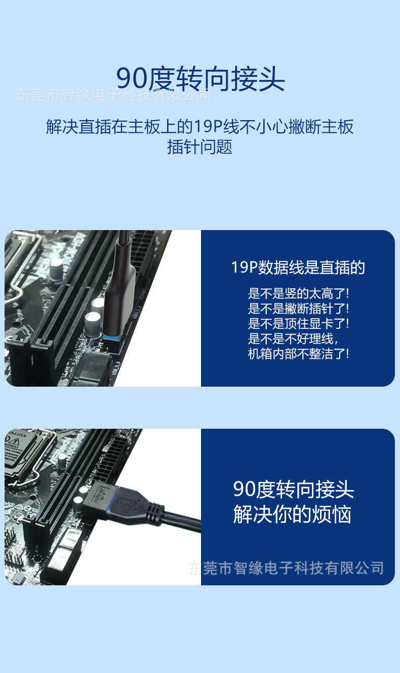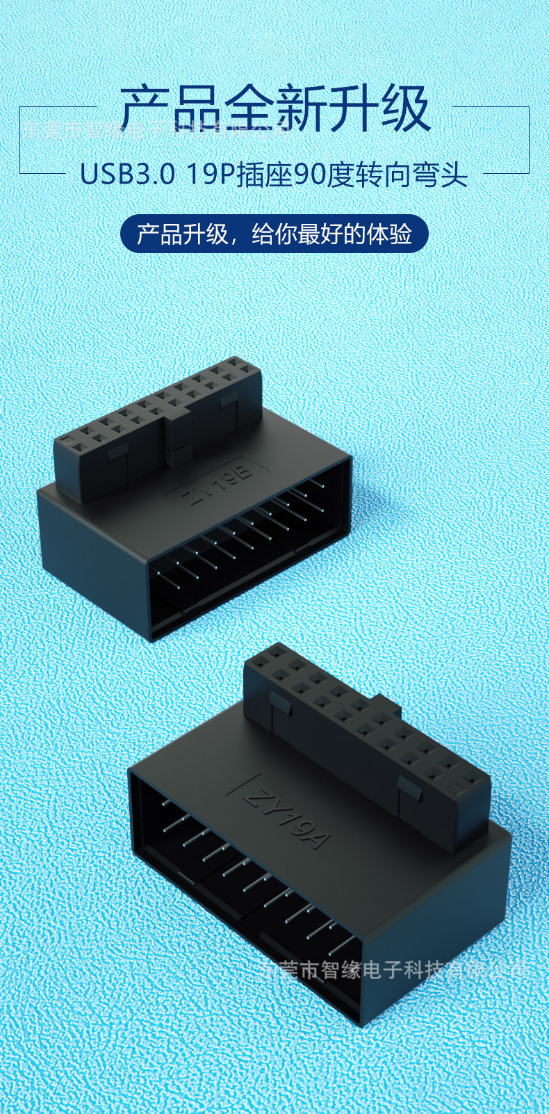 | Product Features | Desktop computer motherboard USB3.0 19P/20p steering connector IDC 90 degree steering head beautification routing artifact machine |