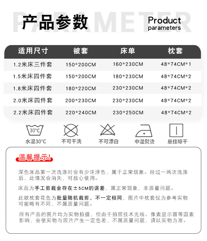 | Dimensions | 1.2m bed sheet set of three (quilt cover 150X200),1.5m sheet four-piece set (quilt cover 150X200),1.8m sheet four-piece set (quilt cover 180X220),2.0m sheet four-piece set (quilt cover 200X230),2.2m sheet set of four (quilt cover 220X240),Single quilt cover 150*200,Single quilt cover 180*220,Single quilt cover 200*230,Single quilt cover 220*240 |