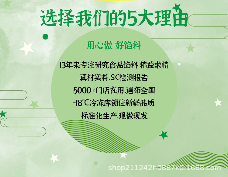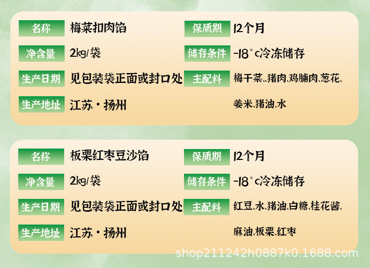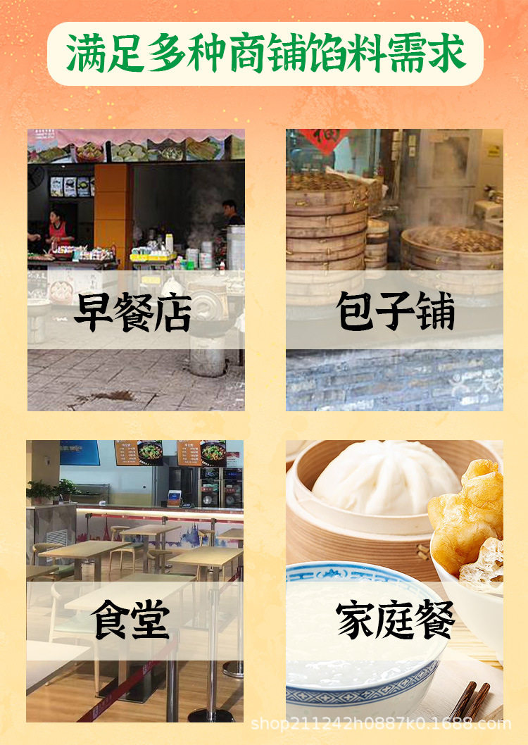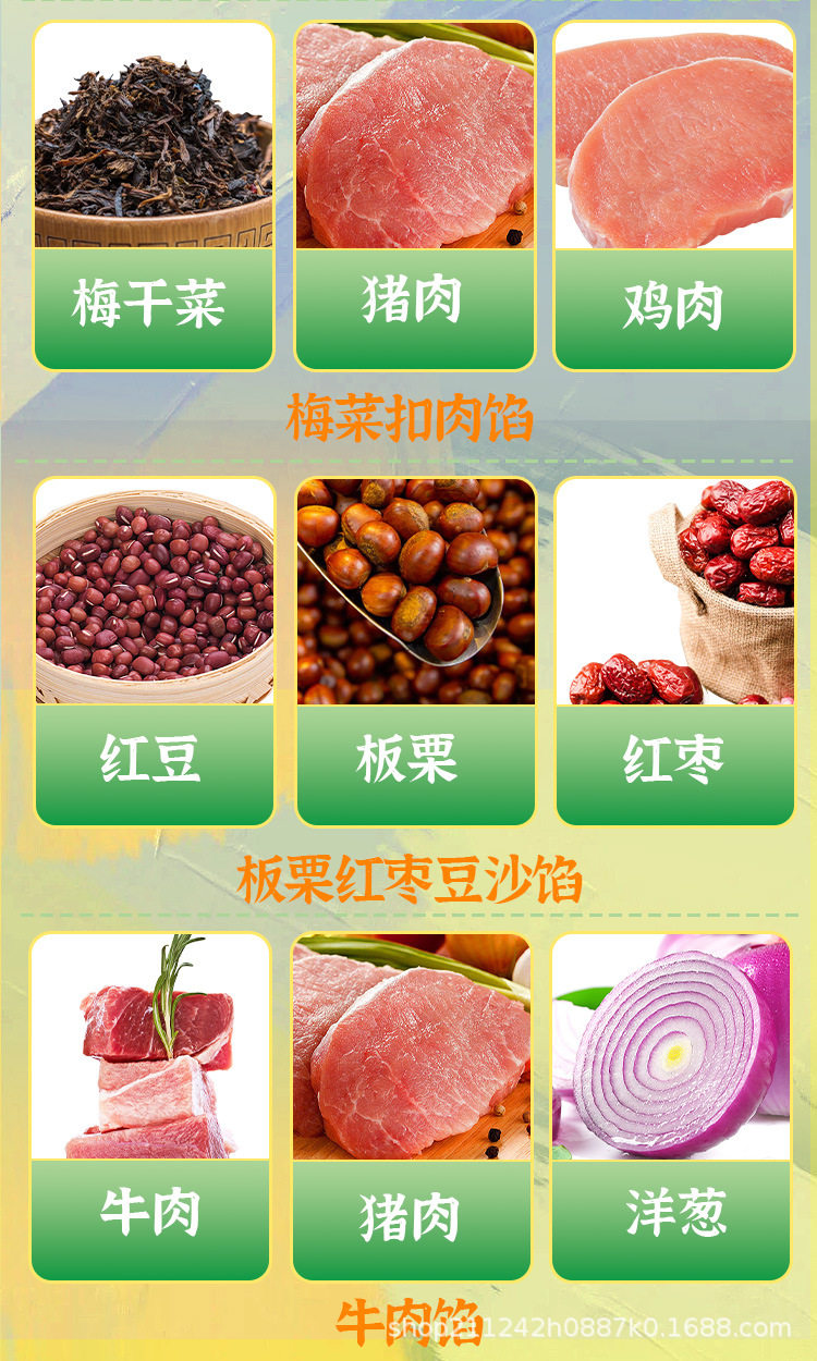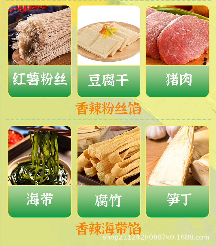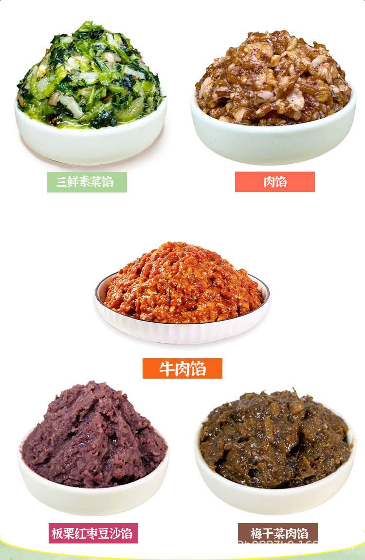| Packaging specifications | Three fresh vegetable fillings 2kg,Fresh juice meat filling 2kg,Chestnut red date bean paste filling 2kg,Meat filling with dried plum and vegetables 2kg,Spicy vermicelli filling 2kg,Spicy kelp filling 2kg,Beef filling 2kg |
