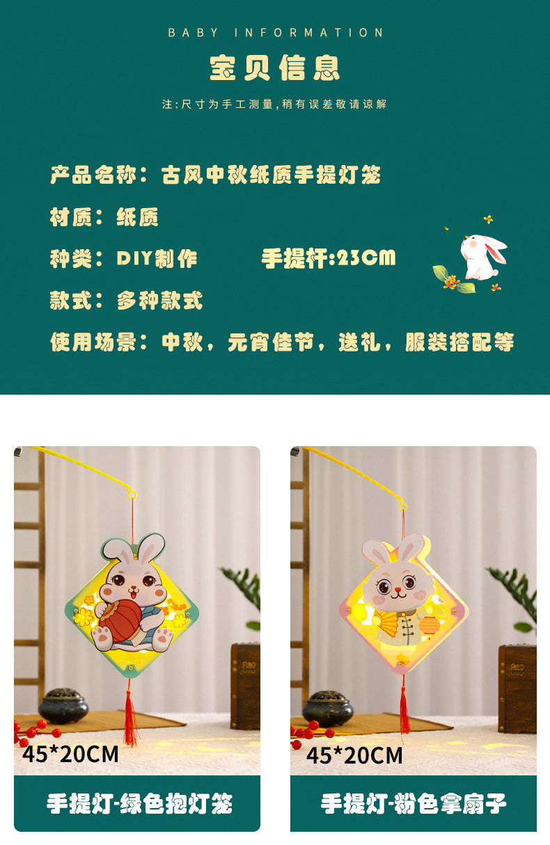 | Colors | Portable Lamp Y-Random,Portable lamp Y-pink fan [36g]],Y-green lantern holding lamp [36g]],Portable lamp Y-red moon cake [36g]],Portable lamp Y-blue moon cake [38g]],Portable lamp Y-red fan [36g]],Y-pink lantern lamp [36g]],Portable lamp Y-round moon cake [35g]],Y-round lantern holding lamp [35g]],HL-portable lamp-random,HL-portable lamp-lion dance playing ball,HL-portable lamp-rabbit holding hair word,HL-Portable Lamp-Rabbit Head Happy,HL-portable lamp-rabbit stars,HL-portable lamp-full moon,HL-Lantern-Mid-Autumn Festival,HL-Lantern-Rabbit Mid-Autumn Festival,HL-portable lamp-lying rabbit,HL-portable lamp-rabbit head take joy,HL-Lantern-Bunny Sitting Lantern,HL-portable lamp-round carp,HL-Lantern-Happy Mid-Autumn Festival,Paper DIY Rabbit Lantern-w [Rabbit Holding Moon Cake Happy Mid-Autumn Festival]],Paper DIY Rabbit Lantern-w [Good Luck Flower Rabbit]],Paper DIY rabbit lantern-w [rabbit holds the moon and flowers the moon is full]],Paper DIY cartoon lantern-H [random]],Paper DIY cartoon lantern-H "pink tie rabbit],Paper DIY cartoon lantern-H [rose flower butterfly]],Paper DIY Cartoon Lantern-H [Sky Blue Swallow]],Paper DIY cartoon lantern-H "yellow small goldfish],Paper DIY Cartoon Lantern-H [Blue Lotus]],Paper DIY Cartoon Lantern-H [Green Blue Flying Golden Cicada]],Carto rabbit paper lantern H-random,Cartoon Rabbit Paper Lantern H-[Green Chang 'e Rabbit Fan]],Carto Rabbit Paper Lantern H-[Powder Chang 'e Rabbit Holding Moon Cake]],Carto Rabbit Paper Lantern H-[Purple Chang 'e Rabbit Lantern]],DIY cartoon lantern Y-random,DIY cartoon lantern Y-[Chang 'e music]],DIY cartoon lantern Y-[Chang 'e sister]],DIY cartoon lantern Y-[Chang 'e rabbit holding moon cake]],DIY cartoon lantern Y-[flower rabbit moon cake]],DIY cartoon lantern Y-[Jade Rabbit Flower Appreciation]],DIY cartoon lantern Y-[national tide hairpin rabbit]],DIY cartoon lantern Y-[red national tide playing rabbit]],DIY Cartoon Lantern Y-[Blue National Tide Music Rabbit]],Spare color lights [pack of 5]],Spare warm white lamp [pack of 5]] |