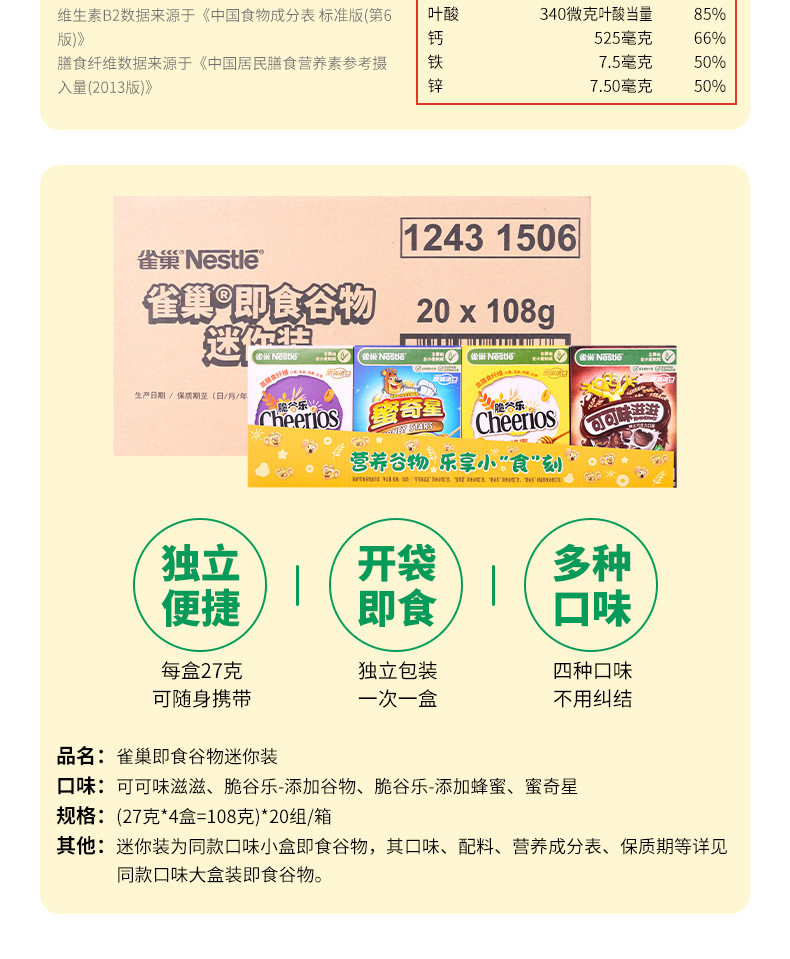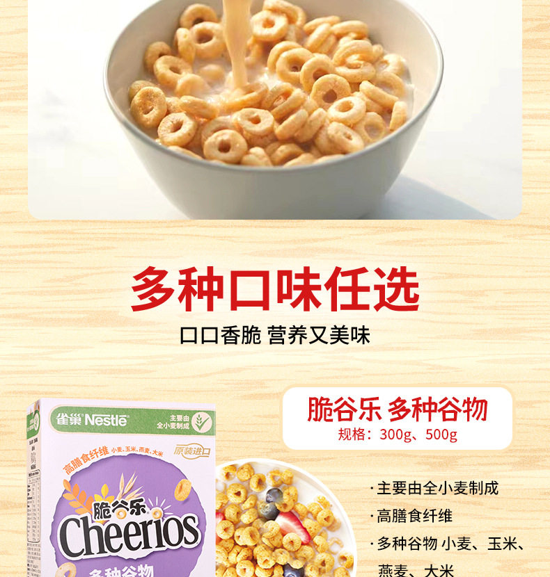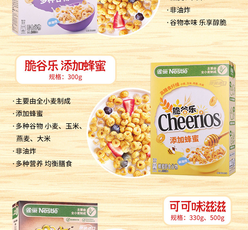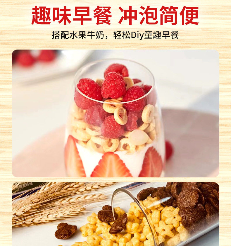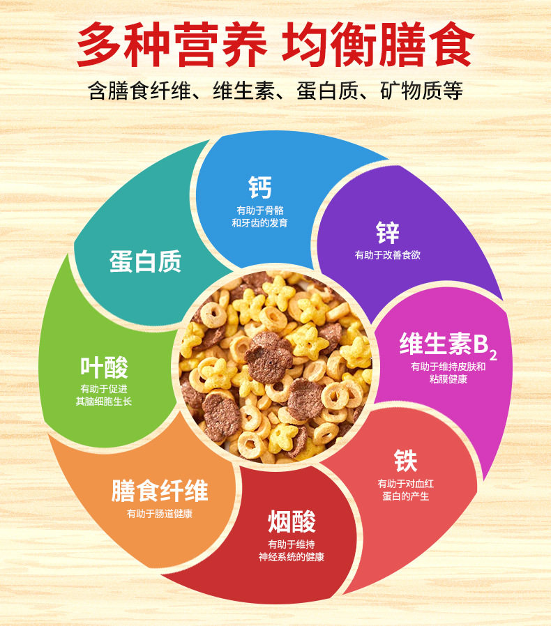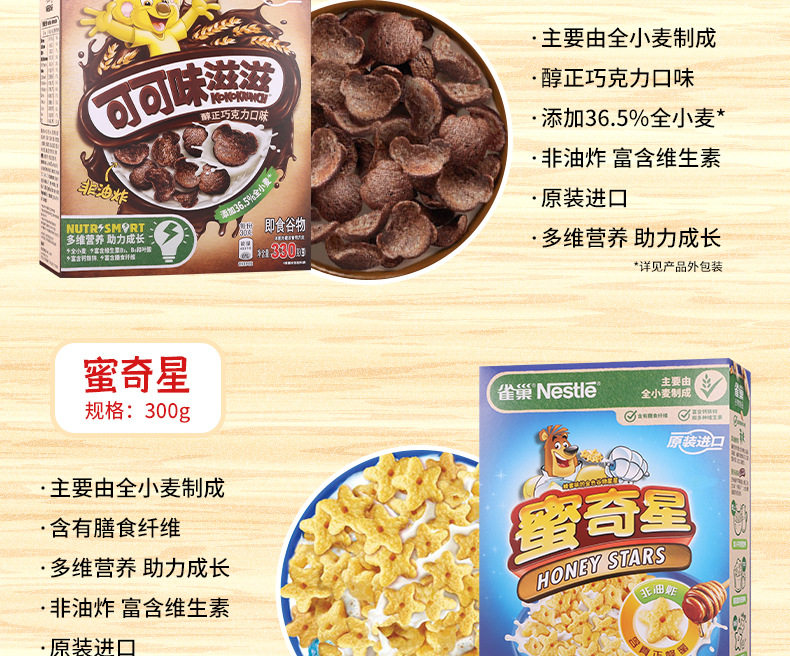 | Packaging specifications | 300g mickey star*5 boxes,330g cocoa flavor*5 boxes,300g crispy cereal*5 boxes,108g four-flavor mini pack*10 sets,300g added honey cereal*5 boxes,500g cocoa flavor*6 boxes,500g crispy cereal*6 boxes |