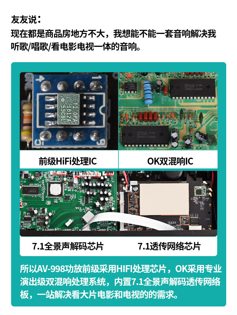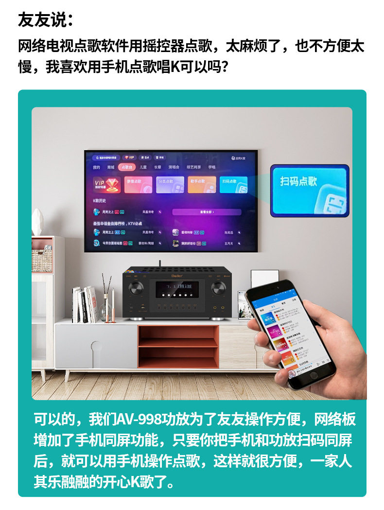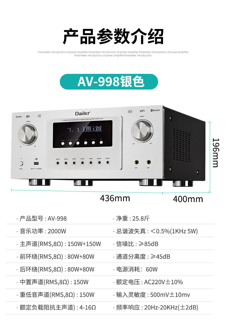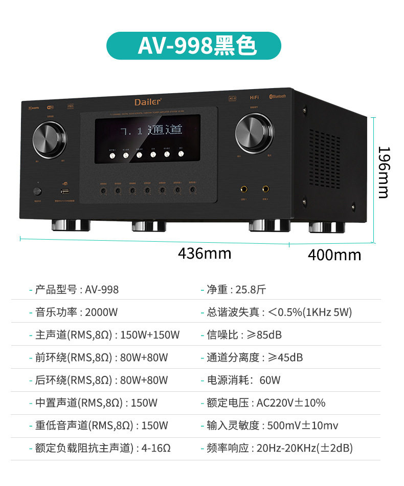 | Color | 998 black single power amplifier,998 silver single power amplifier,Av-998 with 330a wireless microphone,Av-998 with sw-d12 subwoofer,Av-998 with k-8888 center,Av-998 with k-8888 surround,Av-998 with k-8888 middle ring,Av-998 black with k-8888 walnut 7.1 complete set,Av-998 silver with k-8888 red 7.1 with microphone |