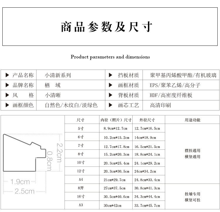| Frame size | 5inch (9cm*13cm),6inch (10.2cm*15.3cm),7inch (13cm*18cm),8inch (15.2cm*20.3cm),10inch (20.3cm*25.4cm),A4(21cm*29.7cm),16inch (30.5cm*40.5cm),A3(29.7cm*42cm) |