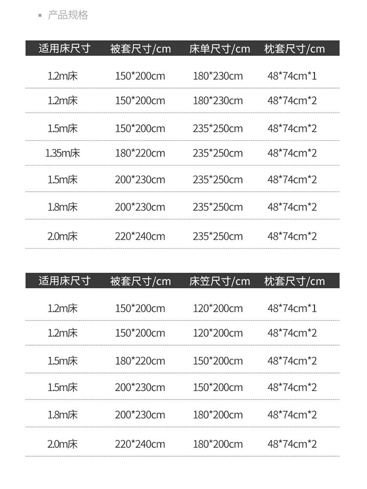 | Dimensions | 1.2m sheets set of three (quilt cover 150*200),1.2m bed sheet four-piece set (quilt cover 150*200),1.5m bed sheet set (quilt cover 150*200),1.5m sheet set (quilt cover 180*220),1.5m bed sheet four-piece set (quilt cover 200*230),1.8m sheets set of four (quilt cover 180*220),1.8m sheets set of four (quilt cover 200*230),2.0m sheet four-piece set (quilt cover 220*240),1.2m bed hat set of three (quilt cover 150*200, bed hat 120*200),1.2m bed hat set (quilt cover 150*200, bed hat 120*200),1.5m bed hat set (quilt cover 180*220, bed hat 150*200),1.5m bed hat set (quilt cover 200*230, bed hat 150*200),1.8m bed hat set (quilt cover 200*230, bed hat 180*200),1.8m bed hat set (quilt cover 220*240, bed hat 180*200),Single bed hat (150*200),Single bed hat (180*200) |