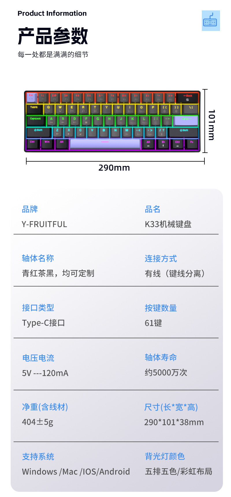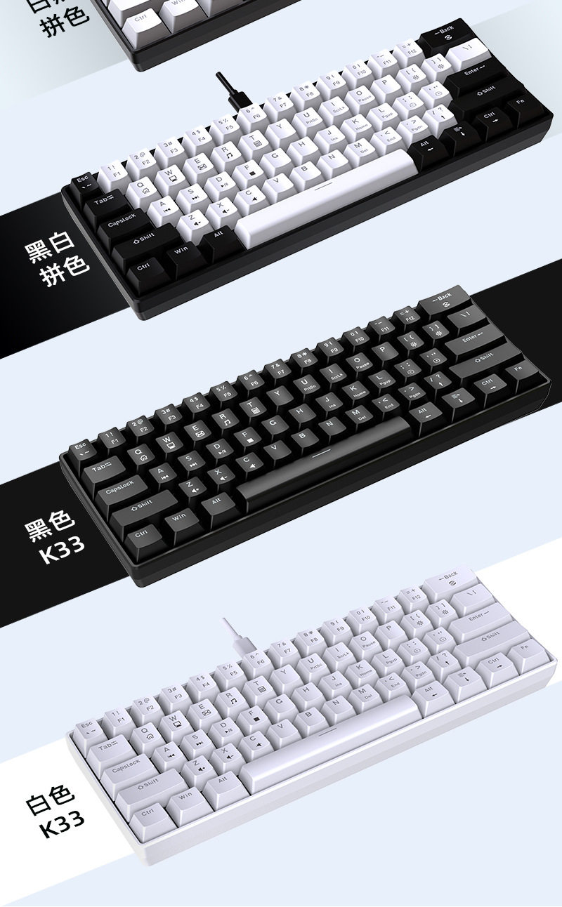 Cross-Border In-Stock K33 Gaming Wired Mechanical Keyboard, Plug-In 61-Key Illuminated Blue Switch Mechanical Keyboard, Computer Accessories