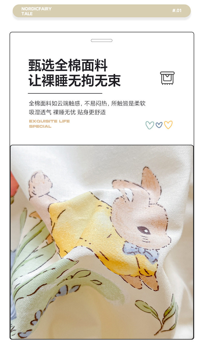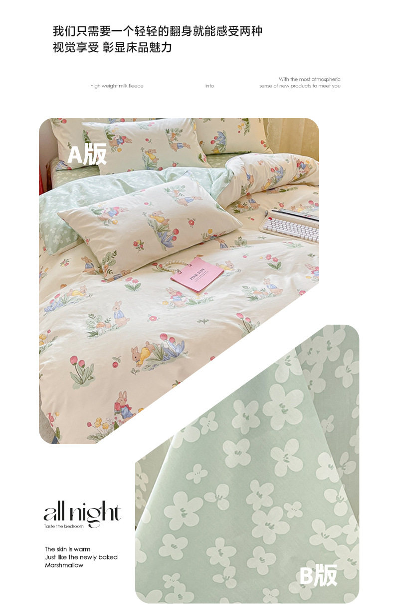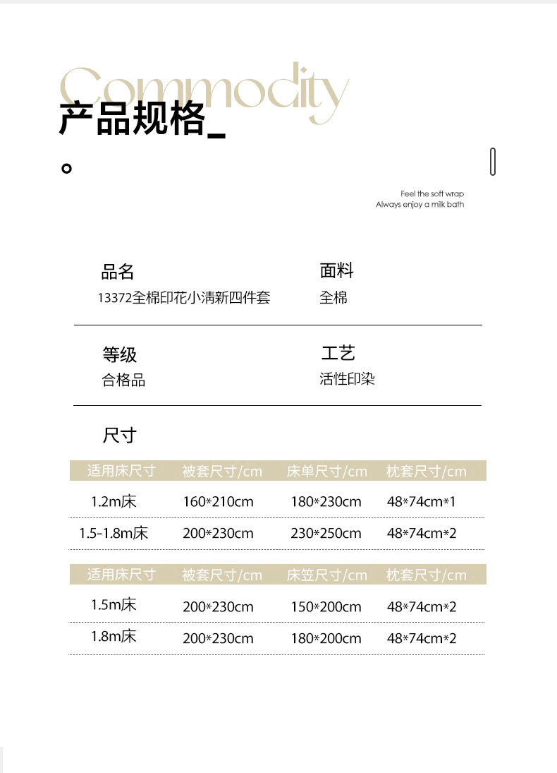 | Dimensions | 1.2m bed sheet three-piece set [applicable to 150*200 quilt],1.5m bed sheet four-piece set [applicable to 200*230 quilt],1.8m bed sheet four-piece set [applicable to 200*230 quilt],1.5m fitted sheet set of four [applicable to 200*230 quilt],1.8m fitted sheet set of four [applicable to 200*230 quilt] |