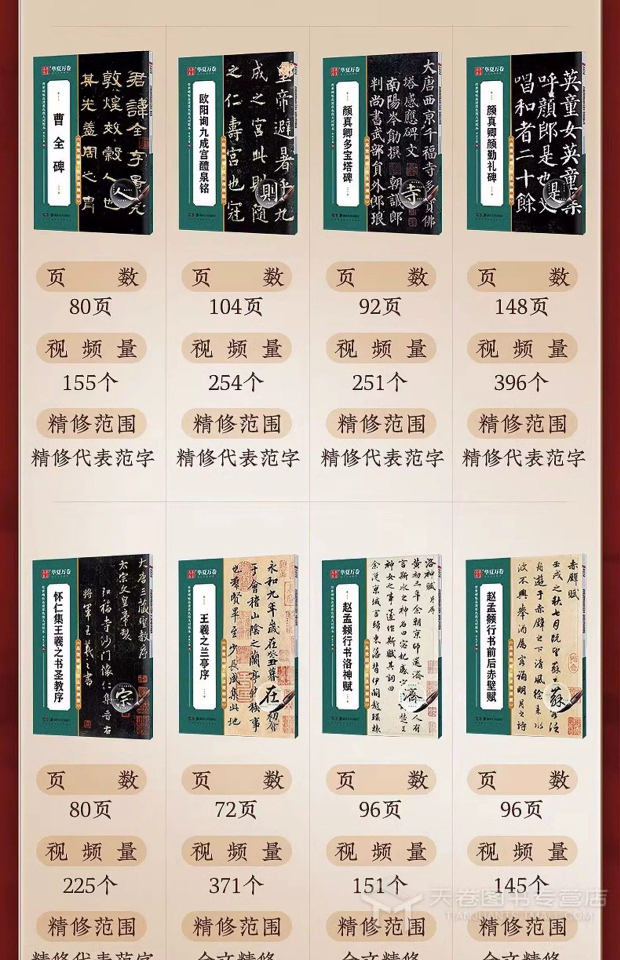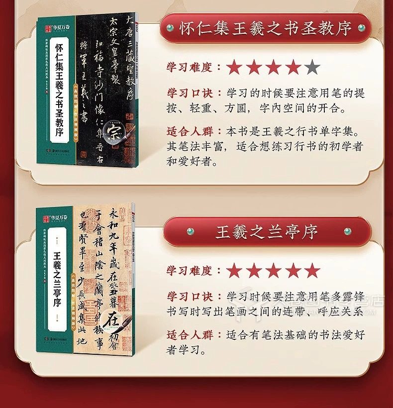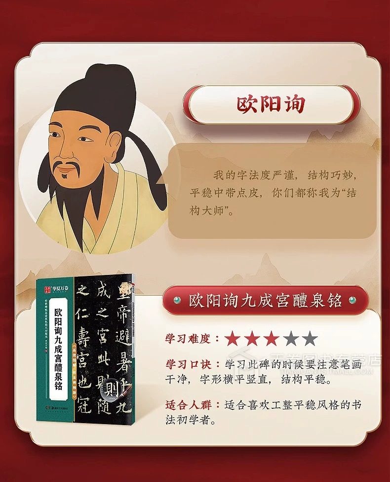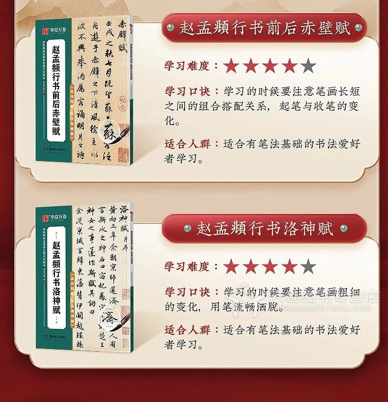 | Specification | Regular script-ouyang xun jiucheng palace liquan ming,Regular script-yan zhenqing duobao pagoda stele,Regular script-yan zhenqing yan qinli monument,Official script-cao quan monument,Running script - zhao mengfu's running script before and after chibi fu,Running script - luo shen fu by zhao mengfu in running script,Running script - preface to the holy religion of huairen's collection of wang xizhi's books,Running script - preface to wang xizhi's orchid pavilion,Seal script - li si's seal script yishan stele,Seal script - deng shiru's thousand-character seal script,Small regular script - erwang xiaokai·le yi lun·luo shen fu thirteen lines,Small regular script - tang dynasty small regular script ling fei jing,Xiao kai - zhao mengfu xiao kai tao te ching,Slim gold body - song huizong's slim gold body·fang fang's poems·three products of inscriptions and paintings,Slim golden body - song huizong's thousand-character essay on slim golden body,Running script - preface to the pavilion of the teng king in wen zhengming's running script |