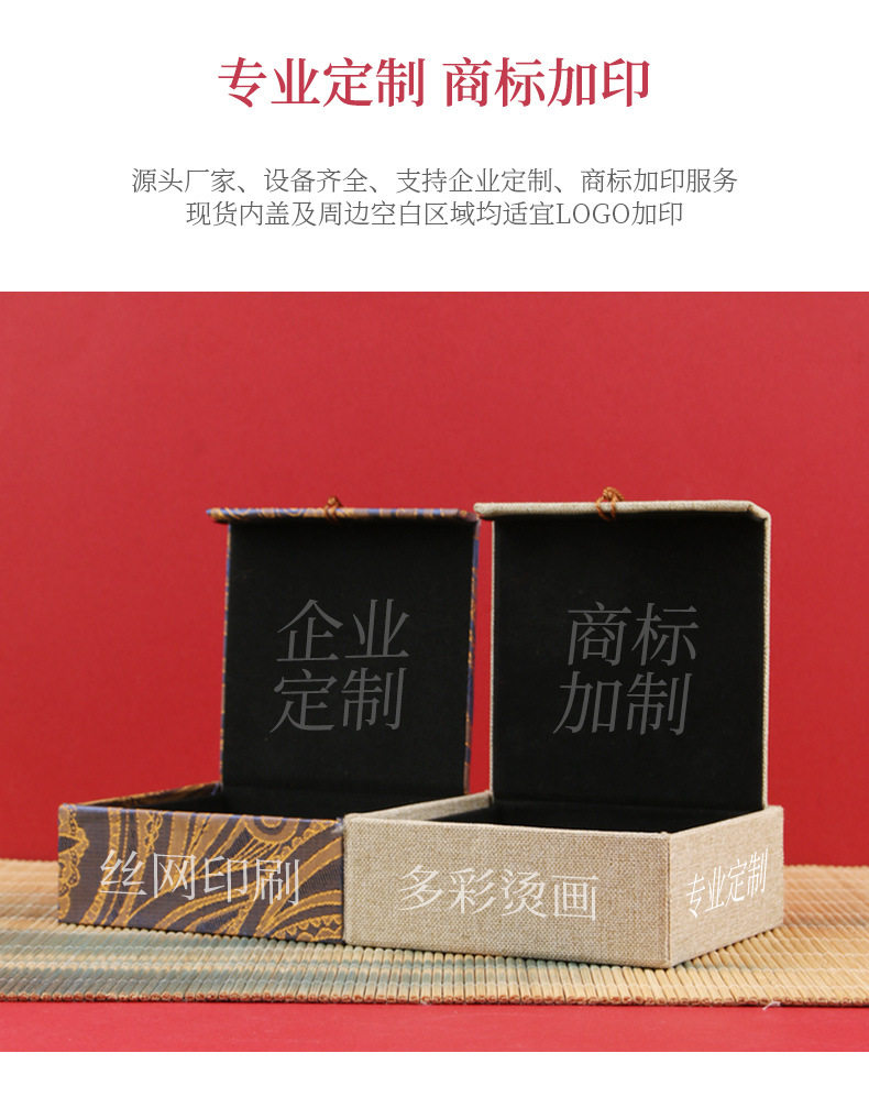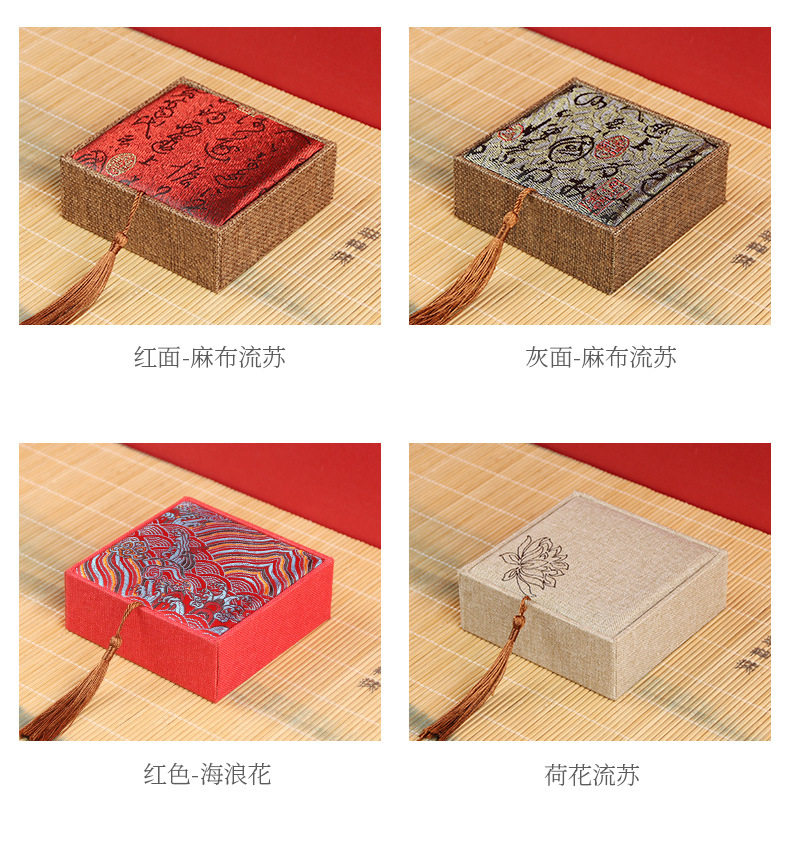 | Color | Red calligraphy,Gray calligraphy,Lotus tassel box,Cashew Red,Cashew Blue,Heritage red,Heritage brown,Burlap red waves,Burlap yellow waves,Linen dark blue waves |