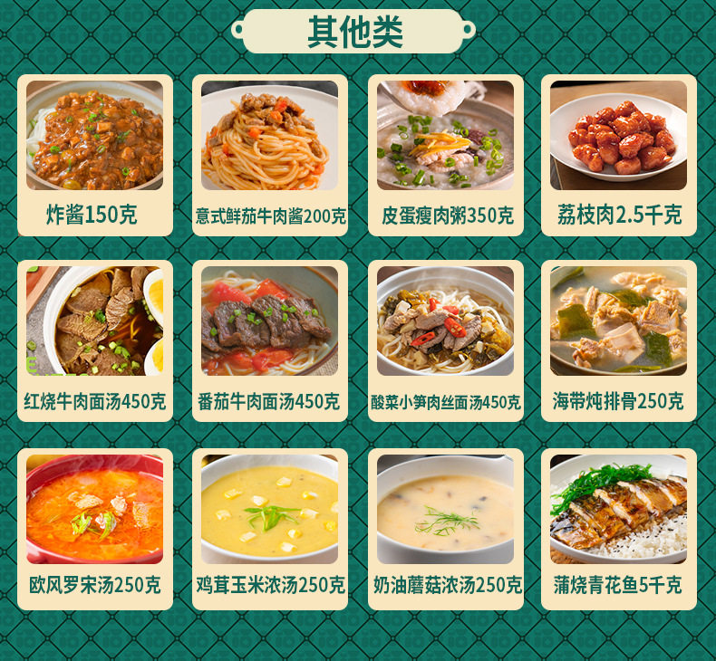 | Taste | Curry chicken 200g,Coconut curry chicken 220g,Mushroom and chicken 200g,Spicy chicken 200g,Braised beef brisket 200g,Grilled fat beef 200g,Black pepper beef fillet 200g,Curry beef 200g,Five-flower plum vegetable stew 200g,Fish flavored shredded pork 200g,Farmhouse stir-fried meat 200g,Sauce-flavored pork ribs 200g,Braised pork 200g,Dongpo pork 200g,No. 1 taiwanese braised pork 200g,Spicy pork belly 200g,Spicy beef brisket 200g,Spicy beef 180g,Fruit and vegetable curry paste (original flavor) 200g,Fruit and vegetable curry paste (slightly spicy) 200g,Thai thick coconut curry paste 200g,Fried sauce 150g,Preserved egg and lean meat porridge 350g,Braised beef noodle soup 450g,Pickled cabbage, bamboo shoots and shredded pork noodle soup 450g,Rich curry chicken fried rice 350g,Garlic beef fried rice 350g,Classic yangzhou fried rice 350g,Seafood three brothers pineapple fried rice 350g,Pickled cabbage and minced pork fried rice 350g,Soy sauce chicken fried rice 350g,Hong kong style crispy bone fried rice 350g,Cantonese style sausage fried rice 350g,Red onion and chicken fried rice 350g,New yangzhou fried rice 350g,Black pepper beef fried rice 400g,Rich curry chicken fried rice 1kg,Soy sauce chicken fried rice 1kg,Garlic beef fried rice 1kg,Hong kong style crispy bone fried rice 1kg,Classic yangzhou fried rice 1kg,Seafood three brothers pineapple fried rice 1kg,Pickled cabbage and minced meat fried rice 1kg,Vegetable and egg fried rice 1kg,New yangzhou fried rice 1kg,Cantonese style sausage fried rice 1kg,Red onion and chicken fried rice 1kg,Black pepper beef fried rice 1kg,Italian beef sauce 200g,Italian meat sauce 200g,Italian black pepper beef sauce 200g,Braised angus beef 100g |