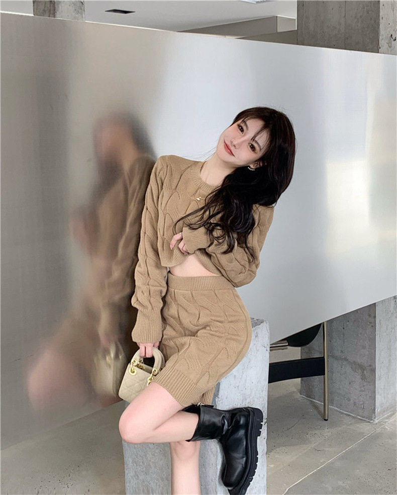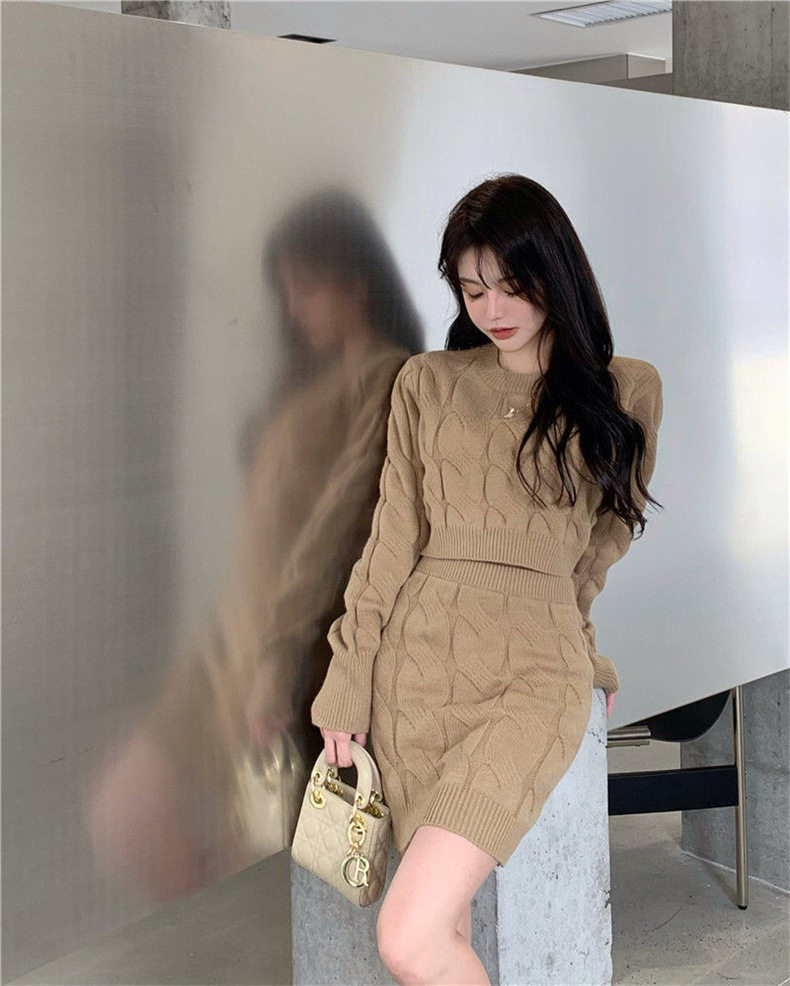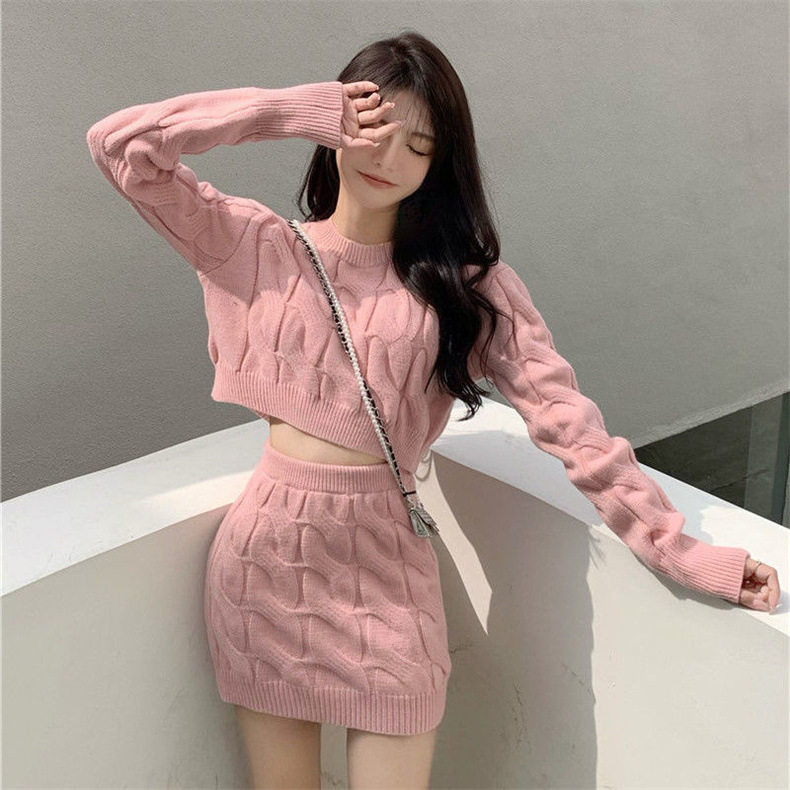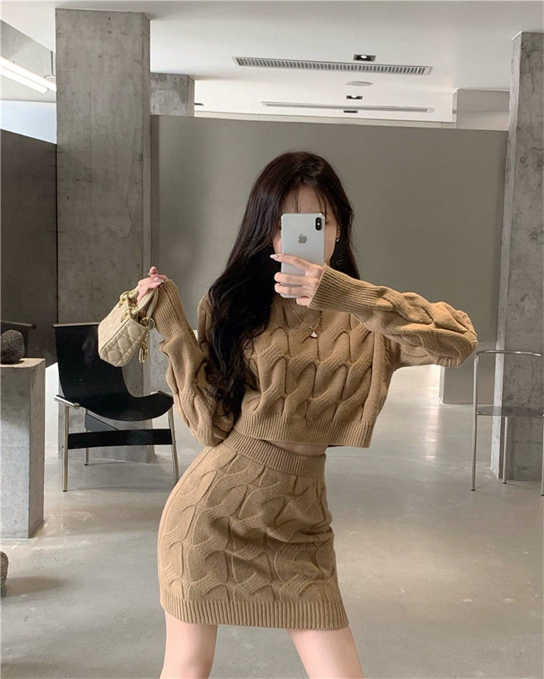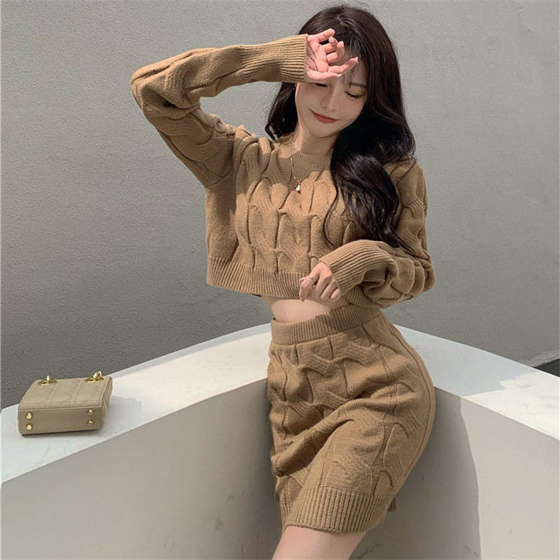 Twist Knitted Sweater Set 2024 Lazy Style Thickened Skirt Women's Slim Long Sleeve High Waist Hip Skirt Two-Piece Set