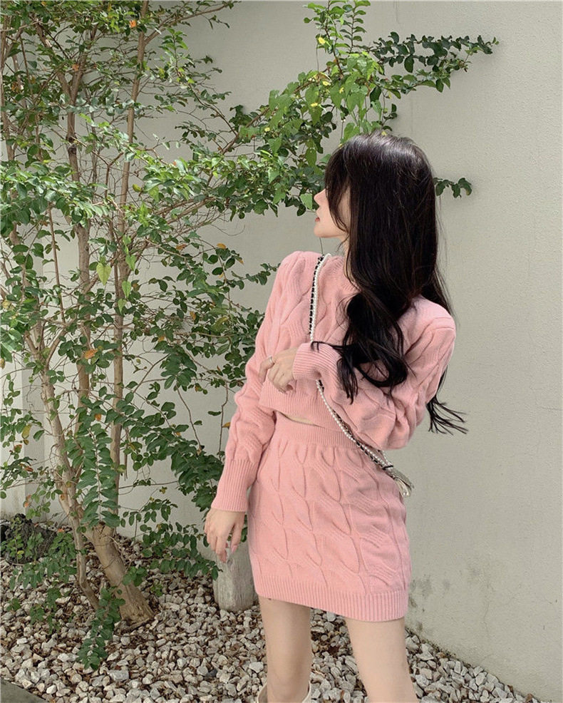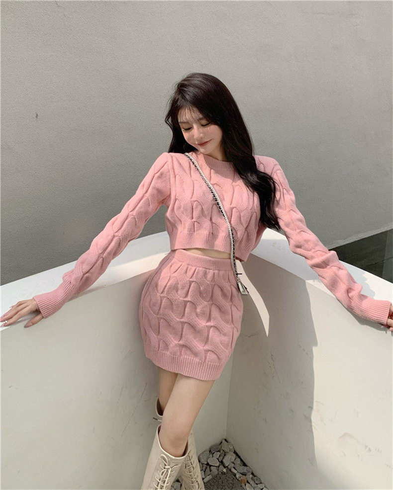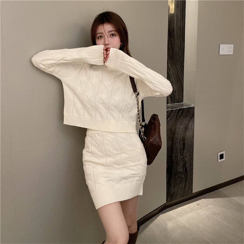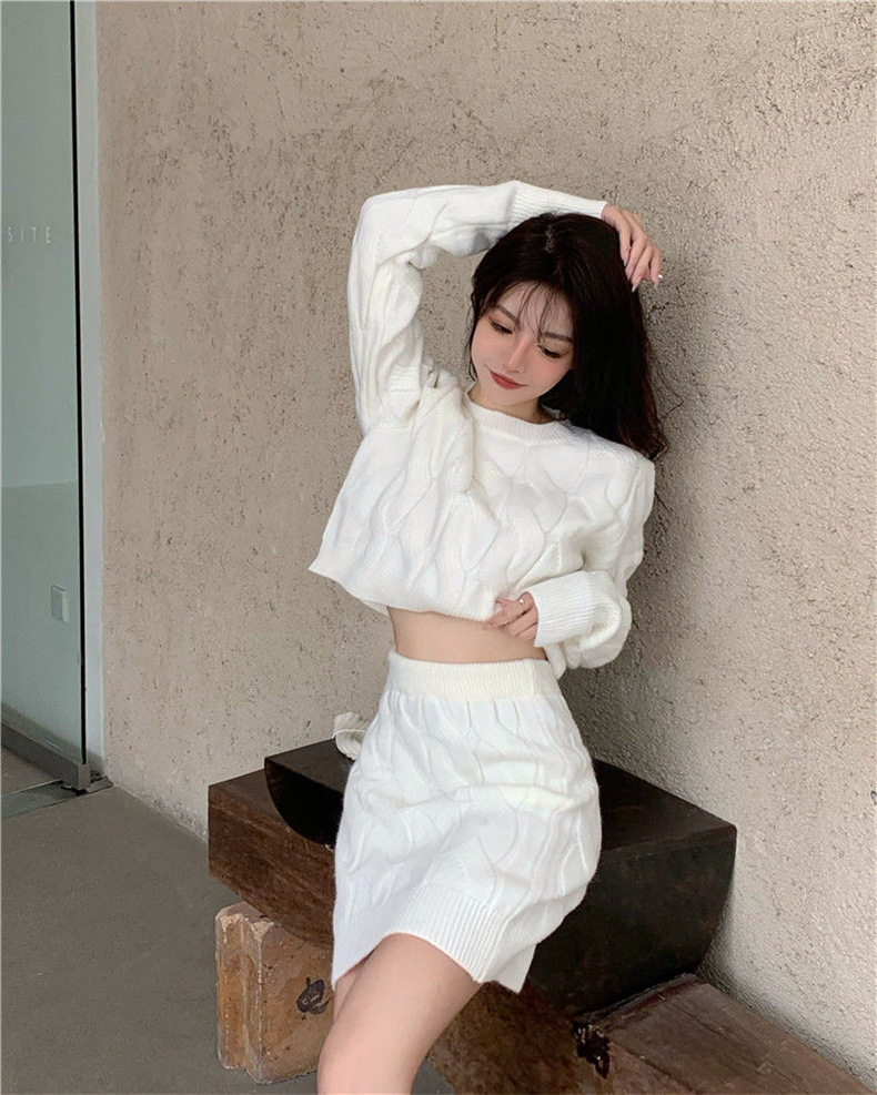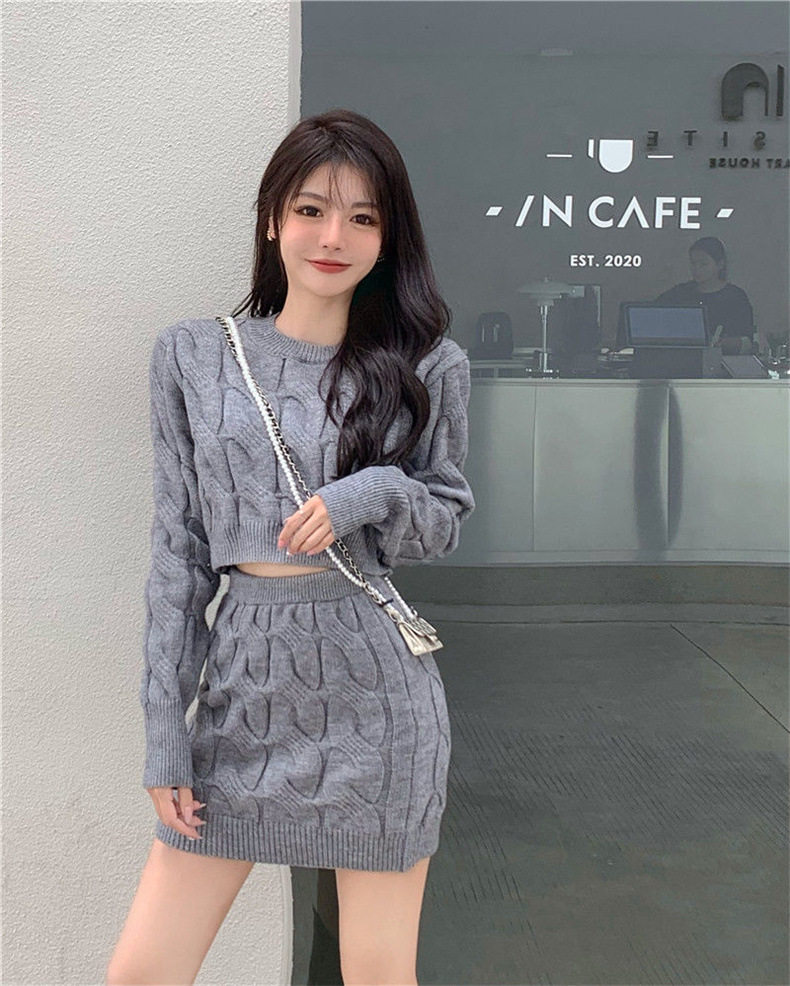 Twist Knitted Sweater Set 2024 Lazy Style Thickened Skirt Women's Slim Long Sleeve High Waist Hip Skirt Two-Piece Set
