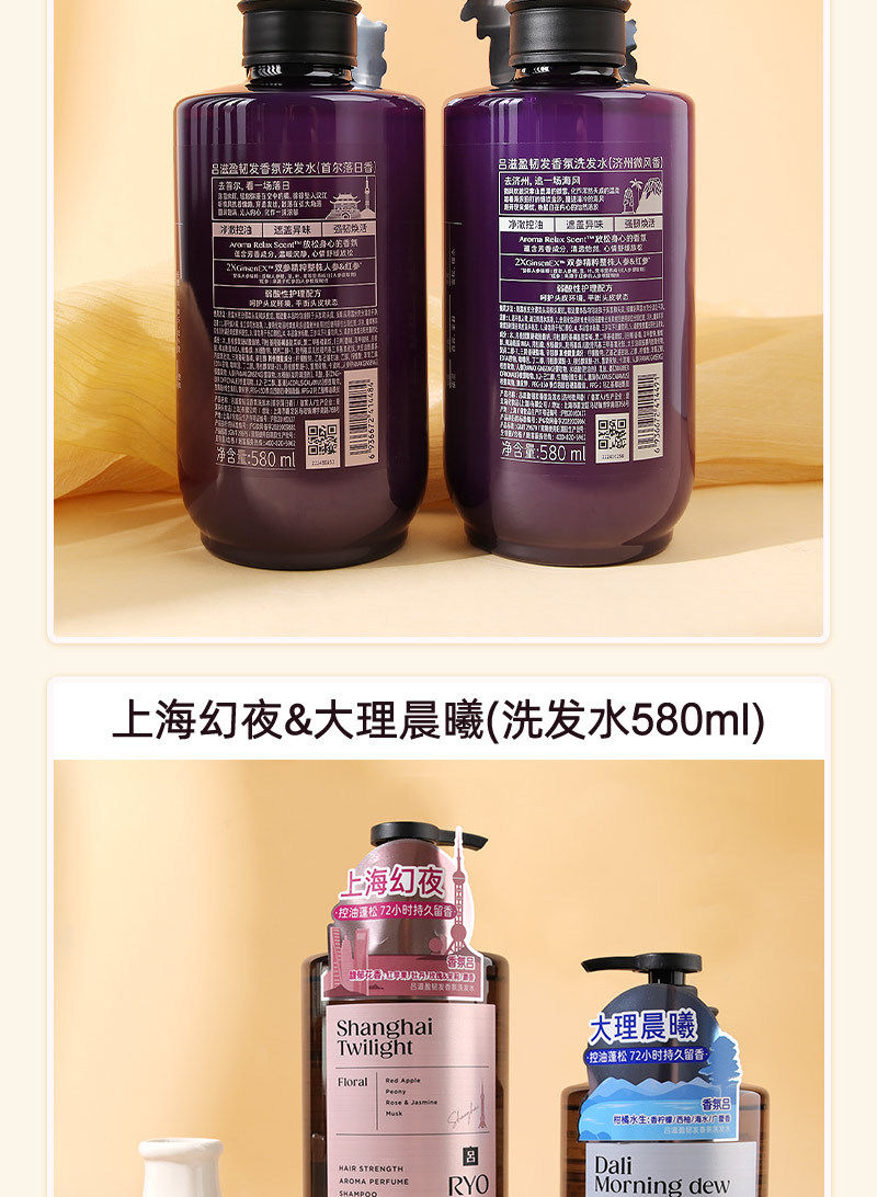 | Net content | Seoul sunset lu shampoo 580ml (rich floral fragrance),Jeju breeze lu shampoo 580ml (cool woody fragrance),Shanghai huan ye lu shampoo 580ml (rich floral fragrance),Dali chenxi lu shampoo 580ml (citrus aquatic),Hangzhou zen tea lu shampoo 580ml (oriental woody fragrance),Hangzhou zen tea lu conditioner 580ml (oriental woody fragrance),Seoul sunset lu conditioner 580ml (fragrant floral) |