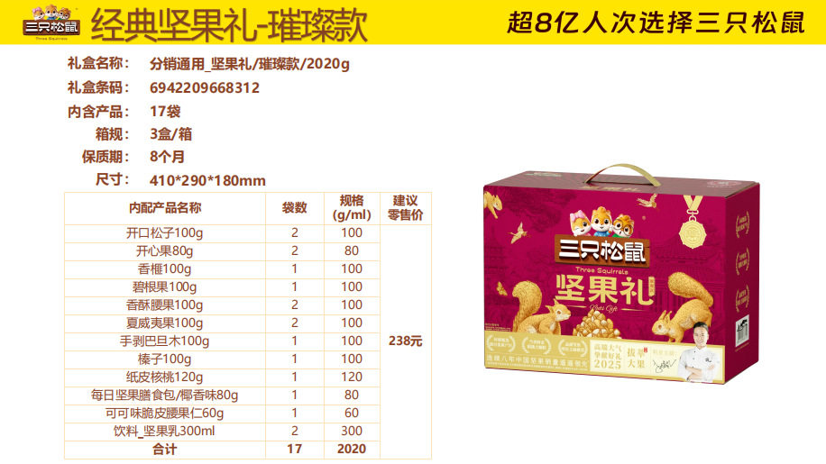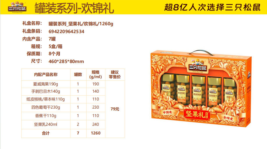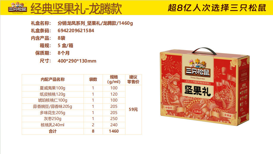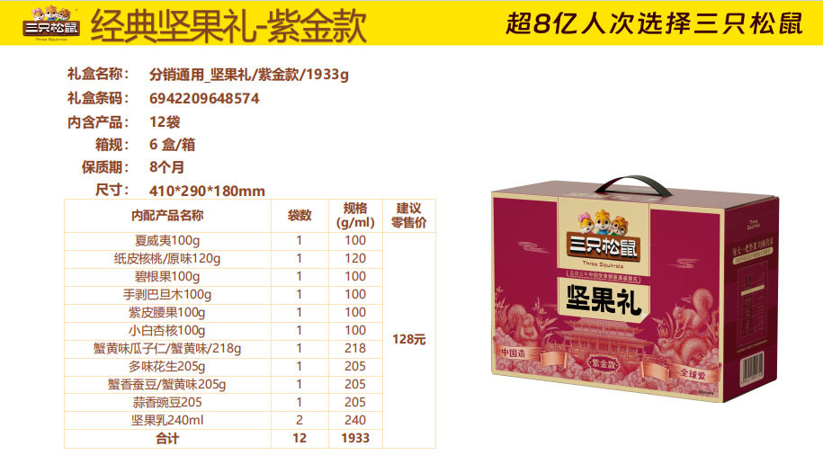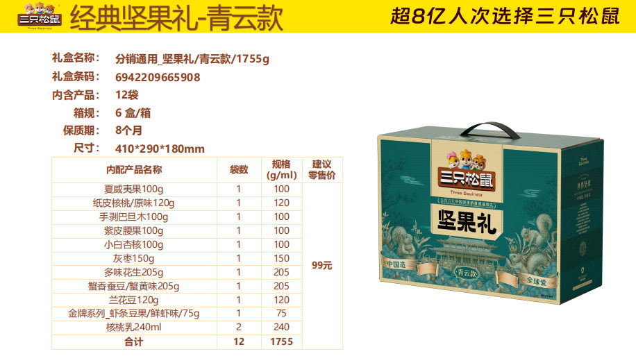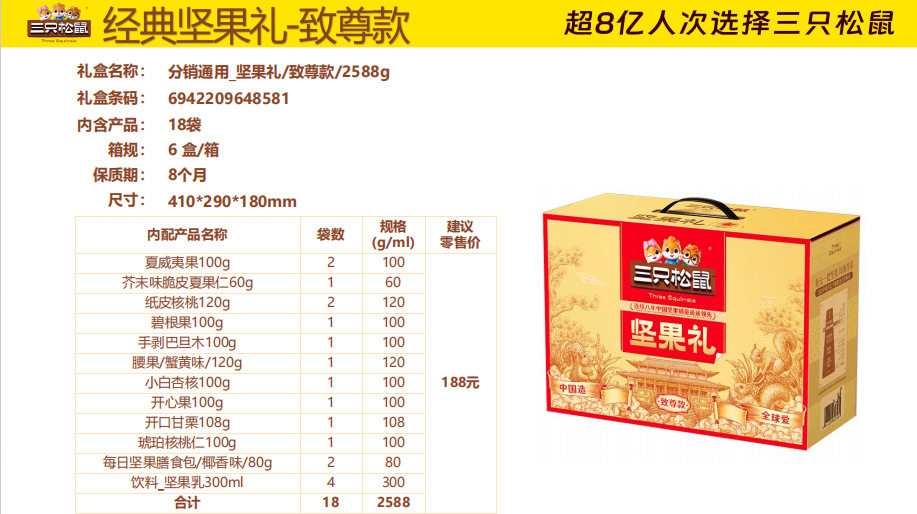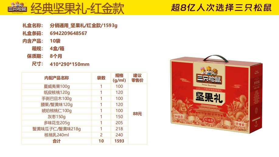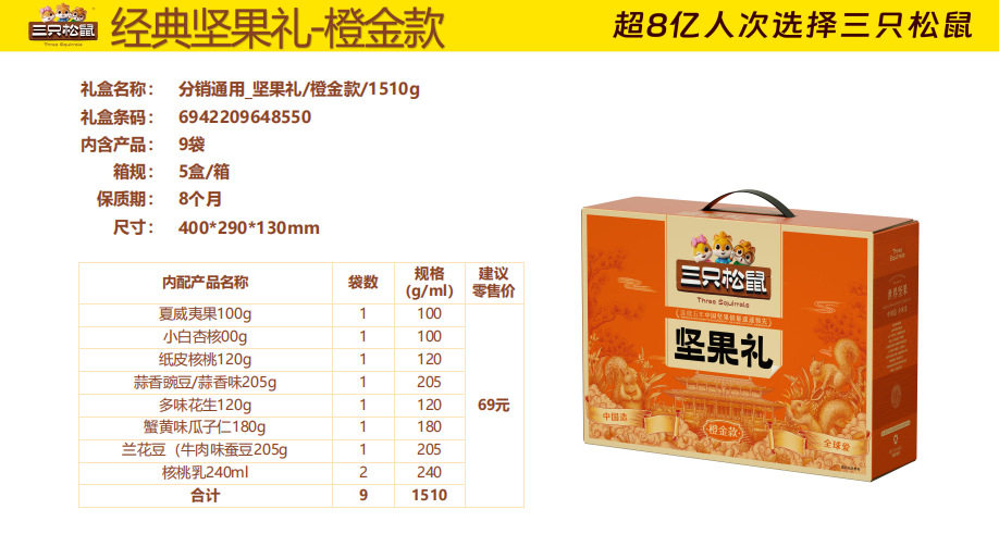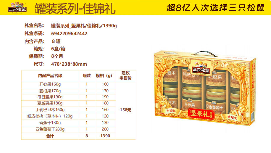| Packaging specifications | Three squirrels longteng style 1460g/8 bags,Three squirrels orange gold 1510g/9 bags,Three squirrels red gold 1593g/10 bags,Three squirrels purple gold 1933g/12 bags,Three squirrels qingyun style 1755g/12 bags,Three squirrels supreme style 2288g/18 bags,Three squirrels brilliant 2020g/17 bags,Three squirrels happy gift 1260g/7 cans,Three squirrels yuijinli 1370g/8 cans,Three squirrels jiajinli 1390g/8 cans,Three squirrels national red gift 106g/6 bags,Three squirrels new year gift 1190g/9 bags,Three squirrels forest gift 1505g/10 bags,Three squirrels hongruili 1010g/8 bags |