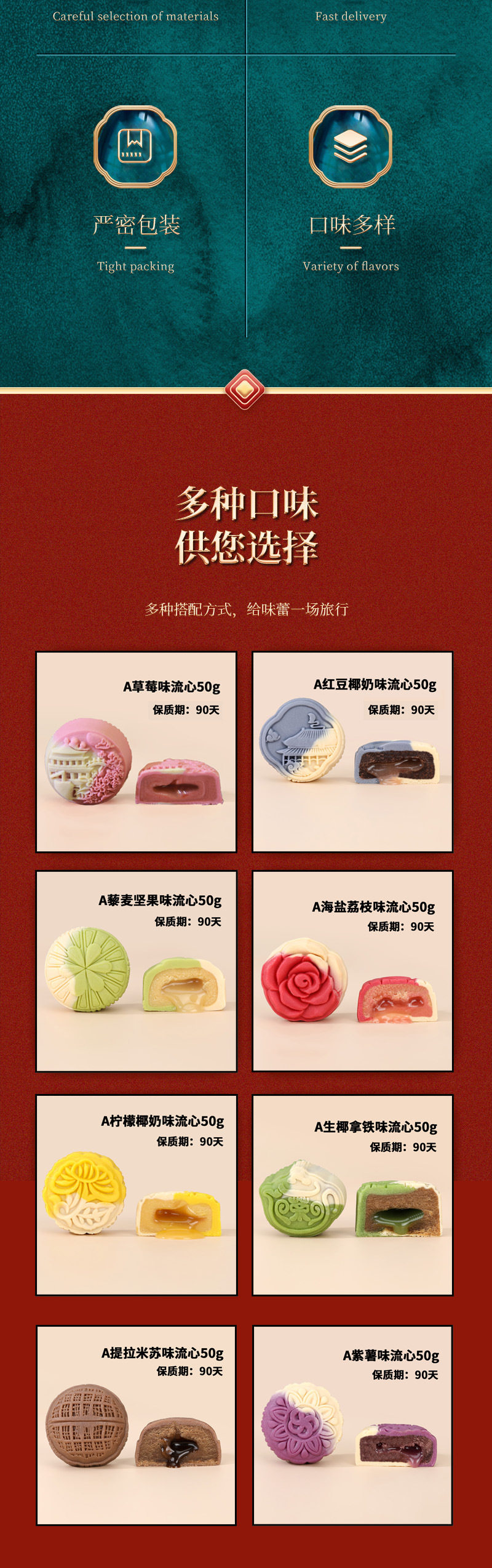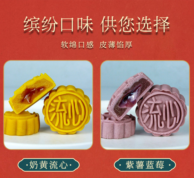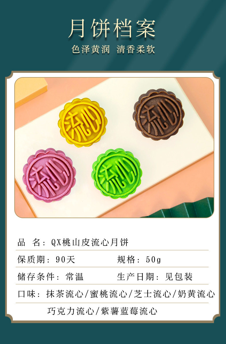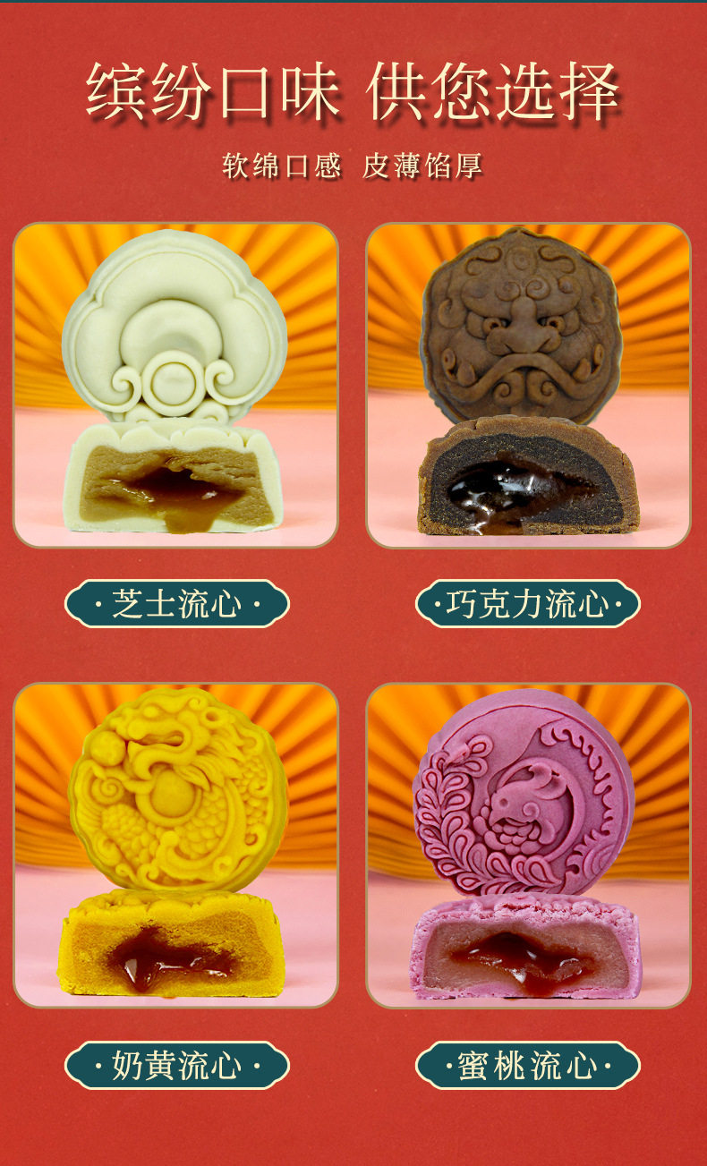 | Packaging specifications | A red bean coconut milk flavor liuxin 50g,A raw coconut latte flavor liuxin 50g,A sea salt lychee flavor liuxin 50g,A quinoa nut flavor liuxin 50g,A purple sweet potato flavor liuxin 50g,A strawberry flavored liquid core 50g,A tiramisu flavor liuxin 50g,A lemon coconut milk flavor liquid heart 50g,Qx-hong kong style custard flavor liuxin 50g,Qx-japanese matcha flavor liuxin 50g,Qx-japanese peach flavor liuxin 50g,Qx-french cheese flavor liuxin 50g,Qx-light milk chocolate liuxin 50g,Qx-purple sweet potato blueberry flavor liuxin 50g,Huahao mid-autumn festival-red wine cranberry flavor liuxin 60g,Happy mid-autumn festival-golden durian flavor liquid heart 50g,Huahao mid-autumn festival-japanese matcha flavor liuxin 60g,Huahao mid-autumn festival-purple sweet potato blueberry flavor liuxin 60g,The dragon and phoenix are auspicious - light milk chocolate flowing heart 60g,The dragon and phoenix are auspicious - hong kong-style custard flavor and flowing heart 60g,The dragon and phoenix are auspicious - japanese peach flavor liuxin 60g,The dragon and phoenix are auspicious - french cheese flavor liuxin 60g,Gradient (qin)-strawberry black tea flavor 50g,Gradient (chess) - walnut sour cheese flavor 50g,Gradient (book)-tremella lily flavor 50g,Gradient (painting)-bamboo branch manlu flavor 50g,Gradient (poetry)-zhenpin creamy yellow flavor 50g,Gradient (fine)-spicy beef flavor 50g,Gradient (flower)-taro chia seed flavor 50g,Gradient (tea)-white peach jasmine flavor 50g,Gradient (persimmon ruyi) - california navel orange flavor 50g,Gradient (ruyi xiangyun)-raw coconut latte flavor 50g,Gradient (fulu double complete) - hazelnut chocolate flavor 50g,Gradient (ruyi lock) - guozhen pomegranate flavor 50g,Huayuyueyuan two-color-purple sweet potato cranberry flavor 60g,Huayuyueyuan two-color-rose cheese flavor 60g,Huayuyueyuan two-color-matcha blueberry flavor 60g,Flowers and moon circles - egg yolk and meat floss flavor 60g |