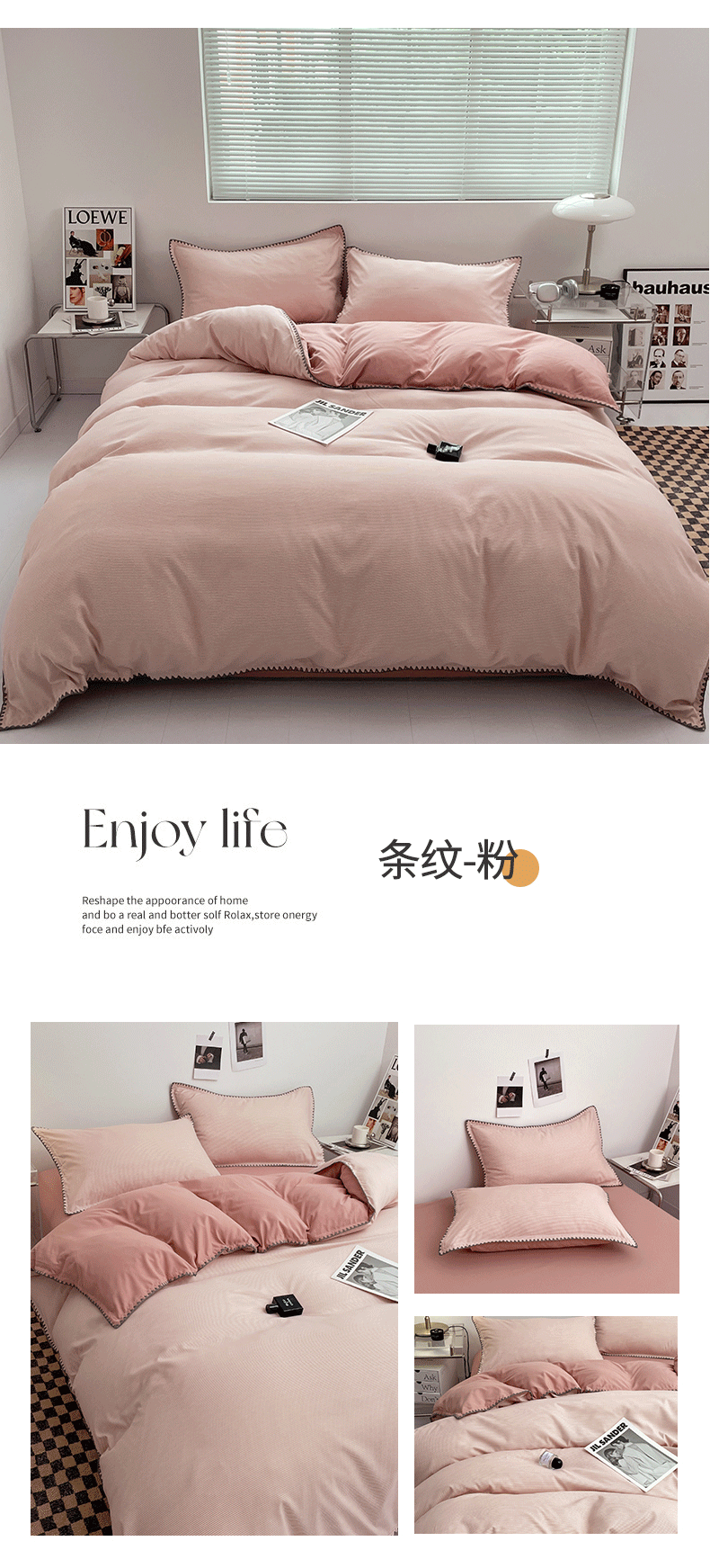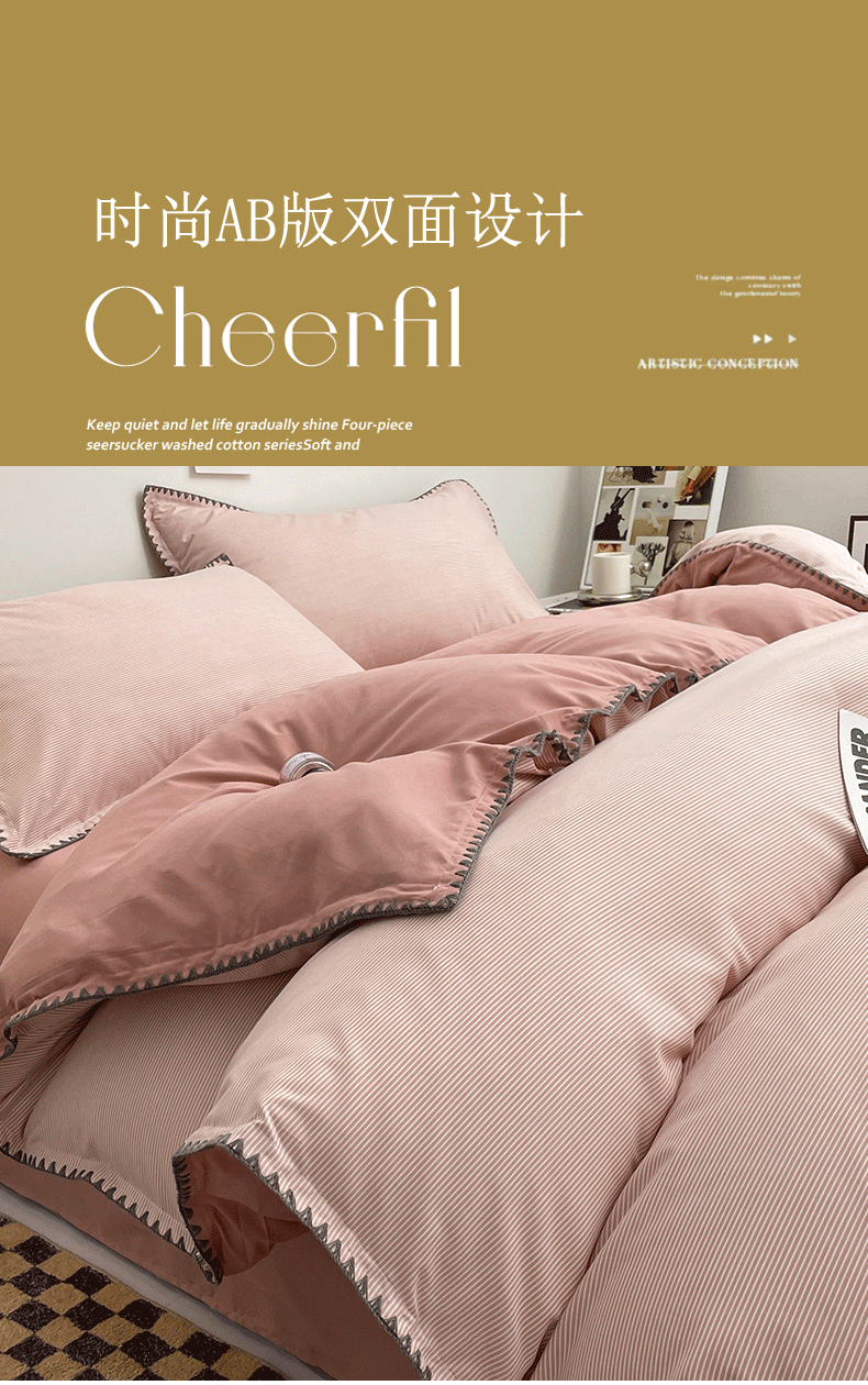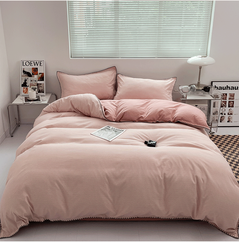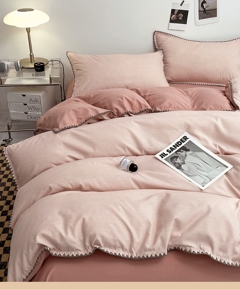 ins Style Double Stripe Washed Cotton Bed Four-piece Set Solid Color Scrub Bed Sheet Quilt Cover Student Three -4-piece Set