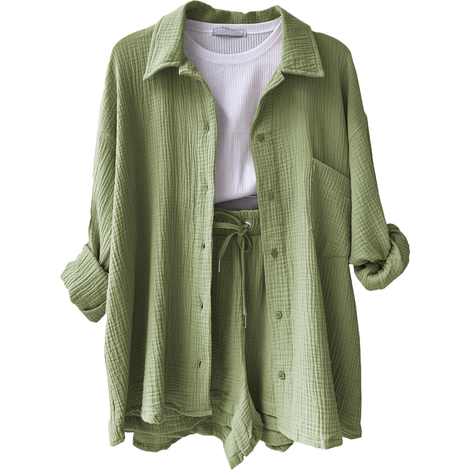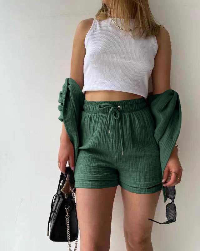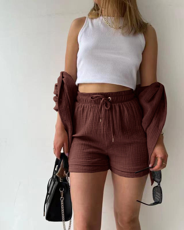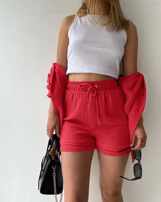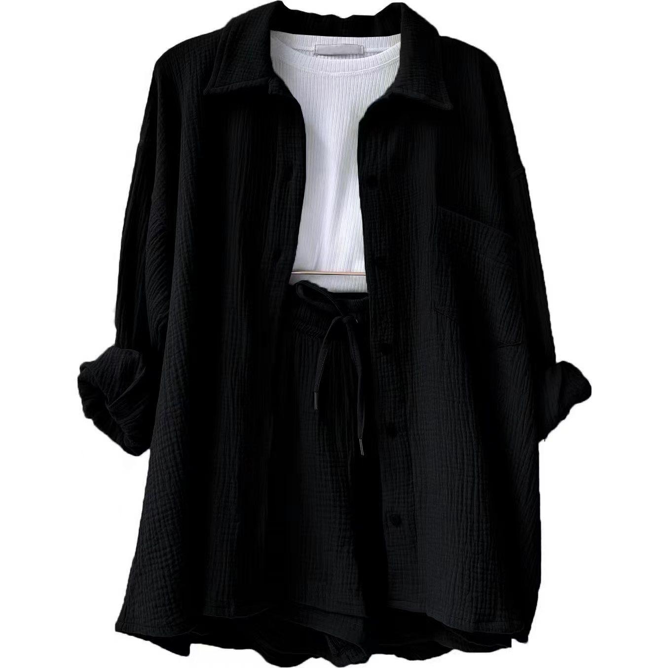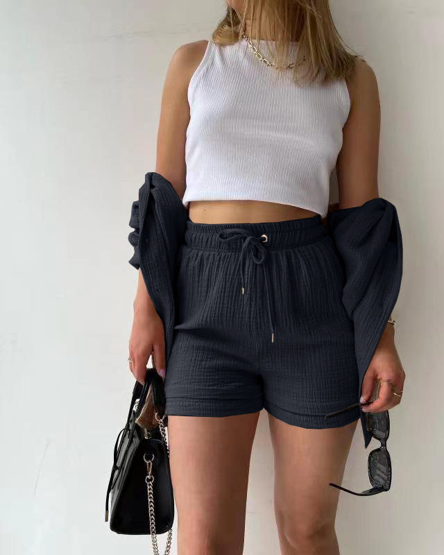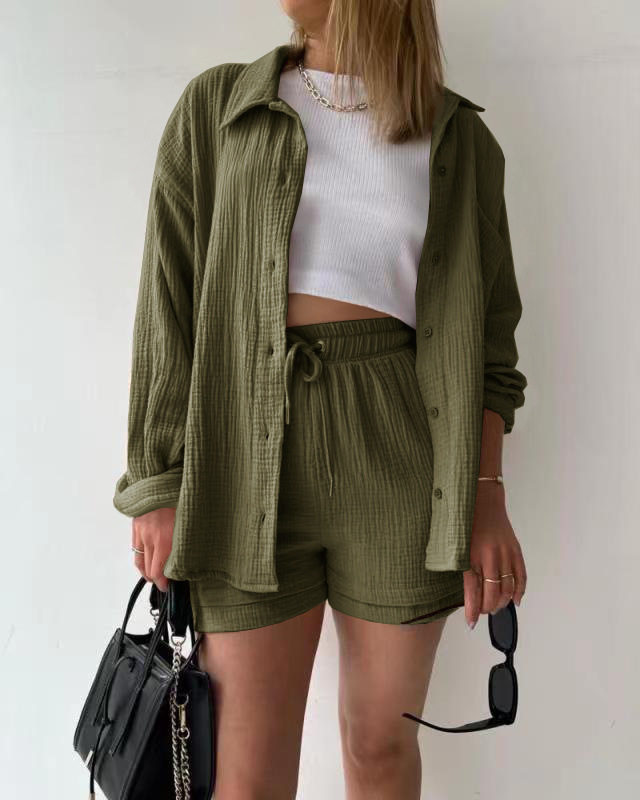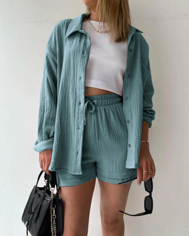 European and American women two sets of wrinkle lapel long sleeve shirt high waist drawstring shorts large size fashion casual suit