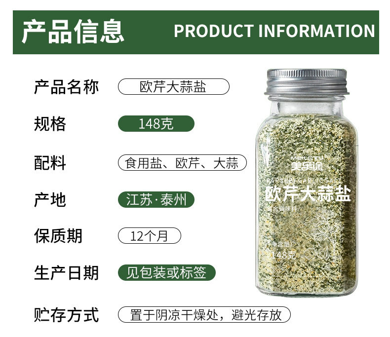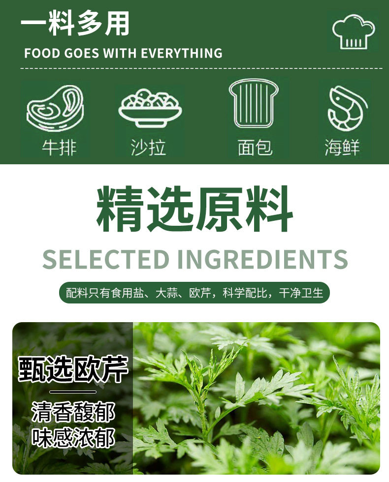 | Packing specification | A bottle of parsley garlic salt 148g,a bottle of ground parsley 20g grinding bottle,a bottle of chopped parsley 10g |