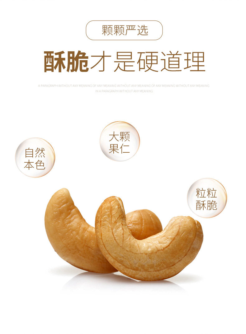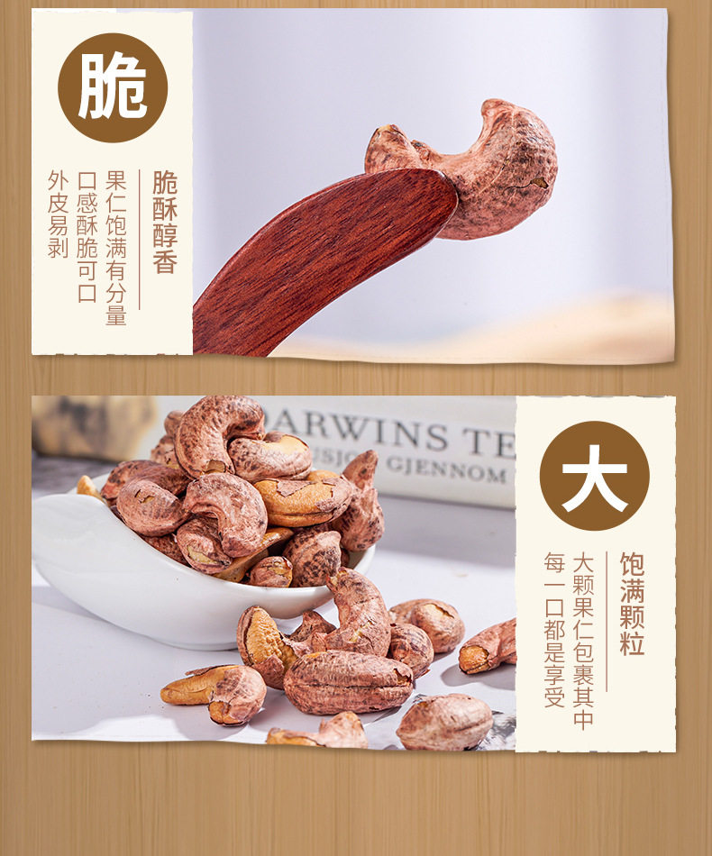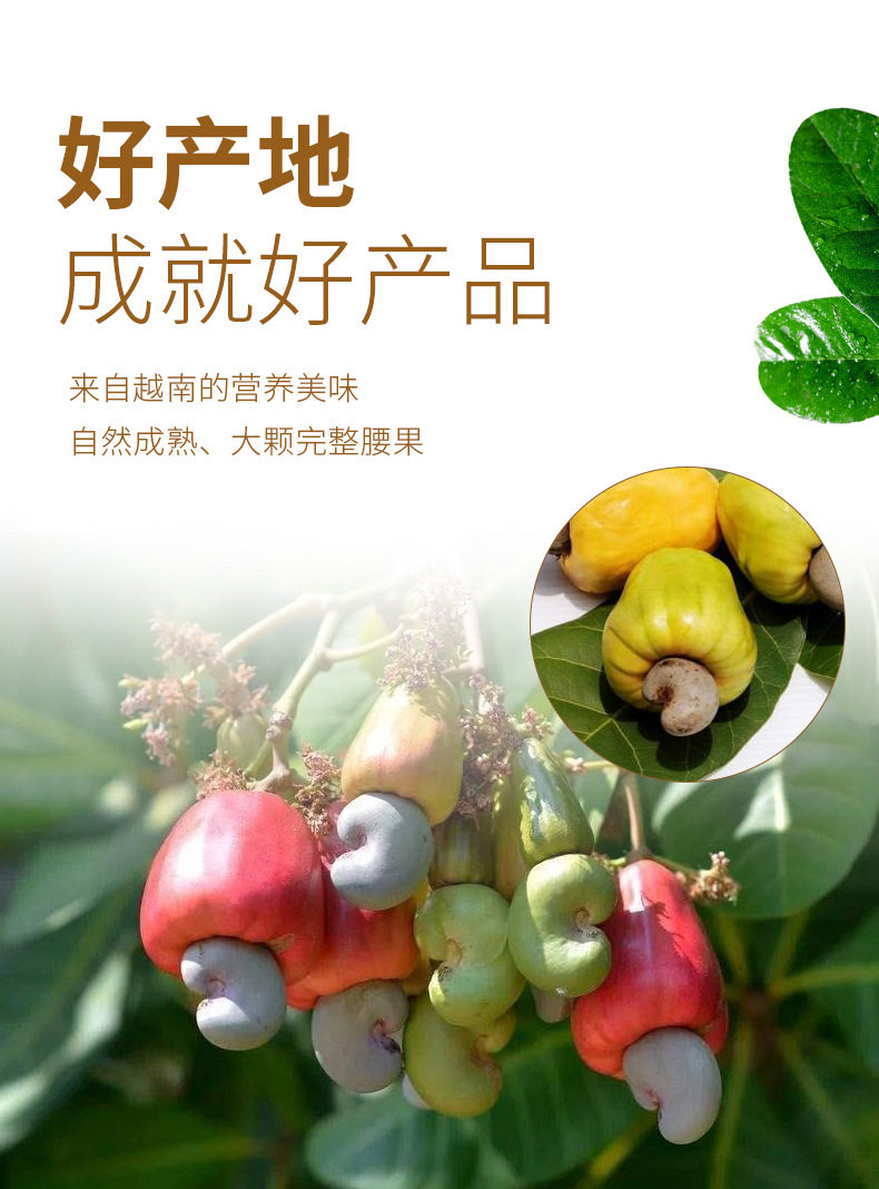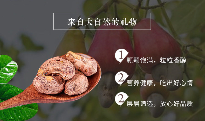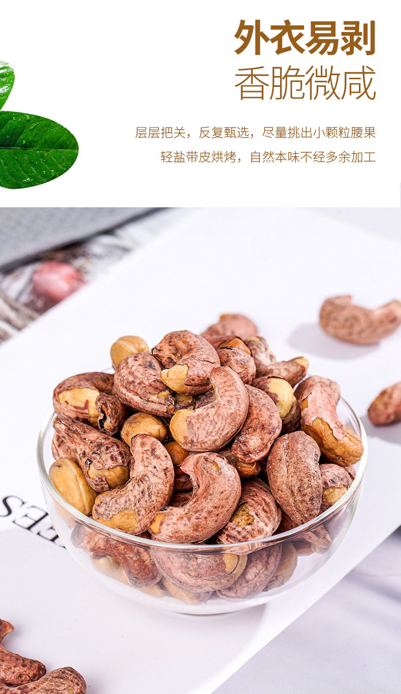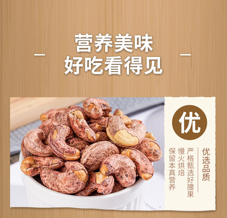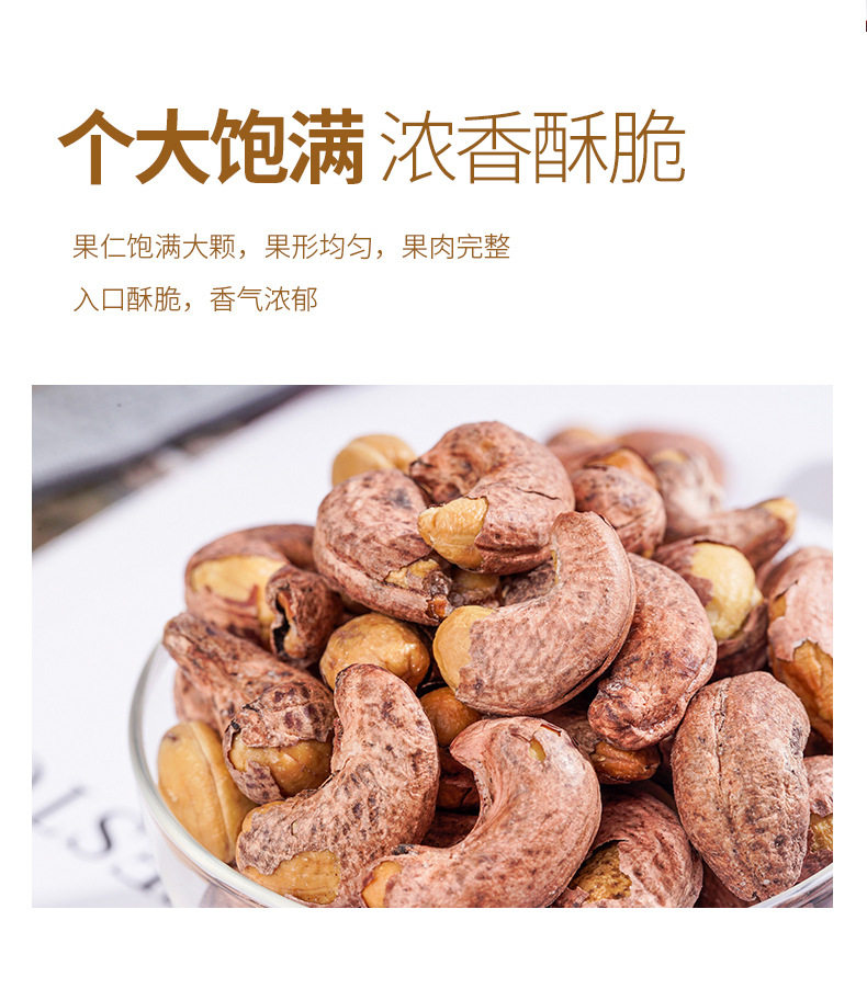| Packing specification | Cashew nuts with skin 100g bag,Cashew nuts with skin 250g bag * 1,Cashew nuts with skin 500g bag * 1 (extra large particles),500g canned cashew nuts with skin (extra large) |