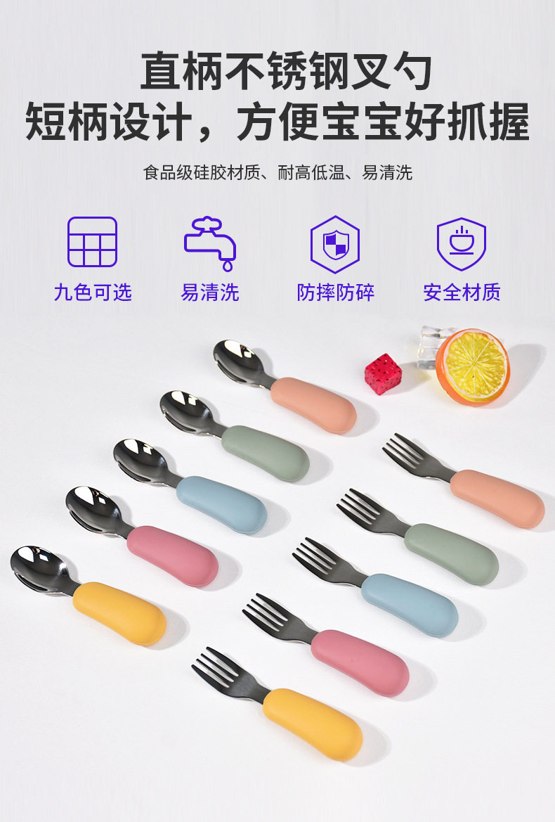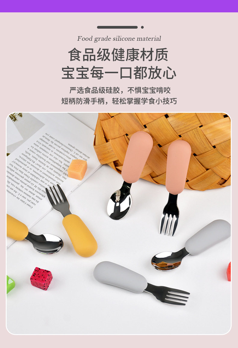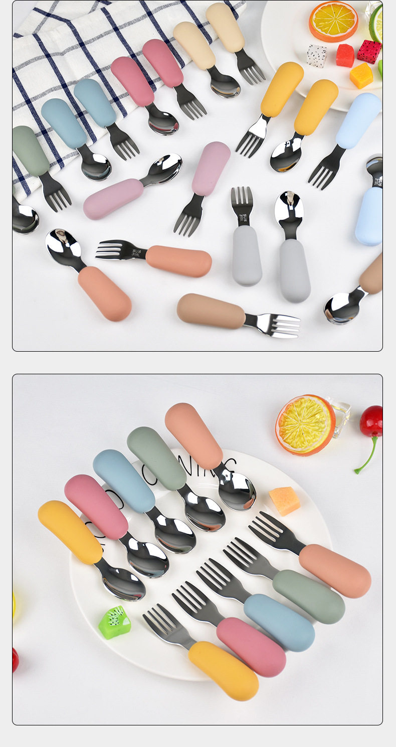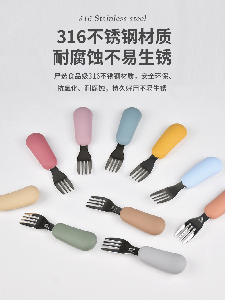 Fruit Scooping Spoon Silicone 316 Stainless Steel Fork Spoon Children's Feeding Tableware Training Set Feeding Supplementary Food