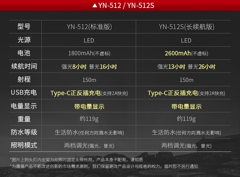 | Color | YN-512S (white light): long endurance version, strong light 13 hours |