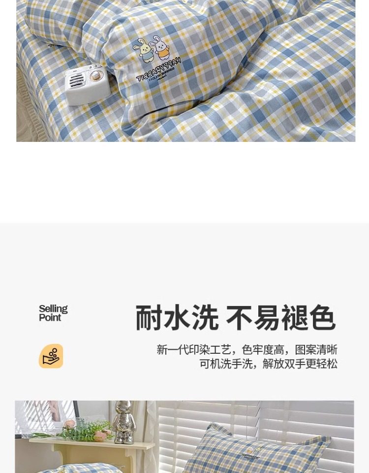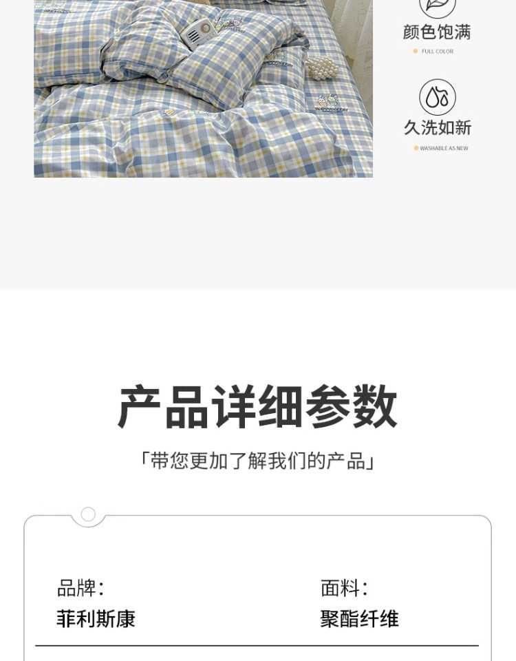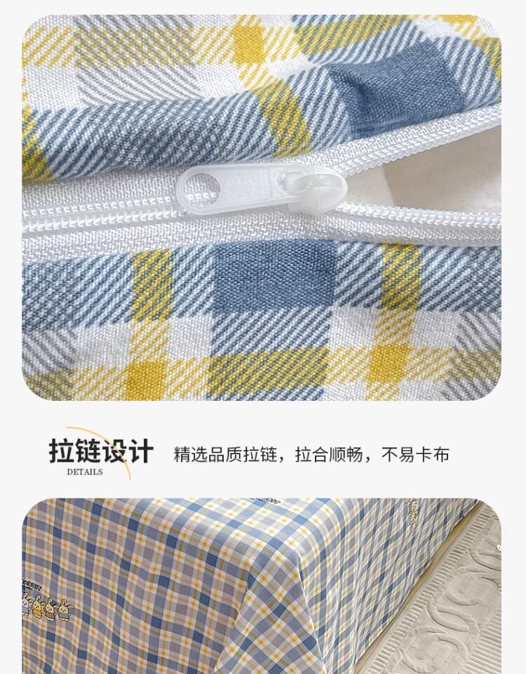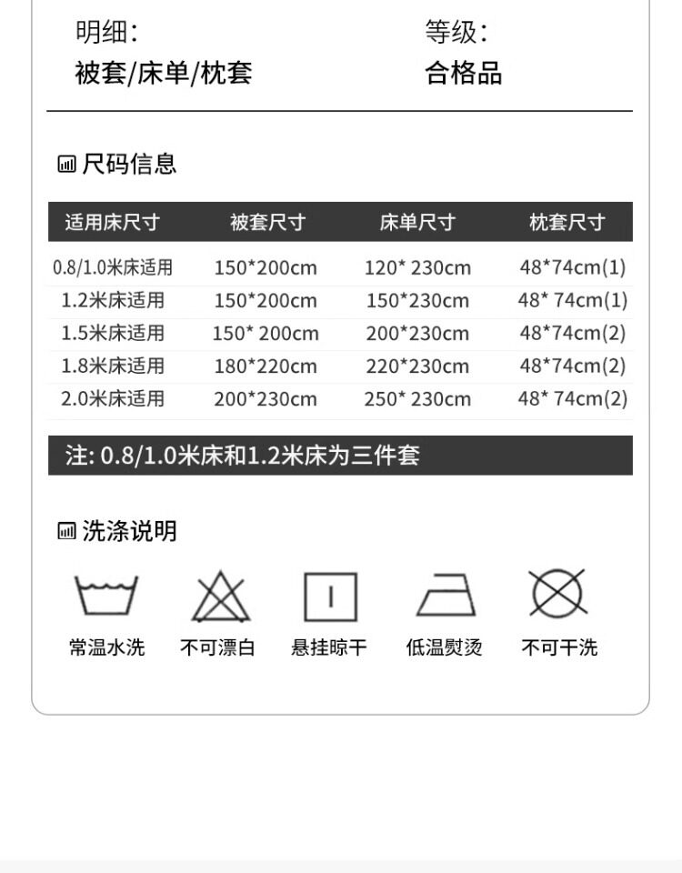 | Dimensions | 1.0m bed set of three (quilt cover 150x 200 sheets 120X230 pillowcase * 1),1.2m bed set of three (quilt cover 150x 200 sheets 150X230,1.5m bed set (quilt cover 150x 200 sheets 200X230 pillowcase * 2),1.8m bed set (quilt cover 180x 220 sheets 220X230,2.0m bed four-piece set (quilt cover 200 × 230 sheet 250 × 230 pillowcase * 2),1.0m bed three-piece student dormitory bed (with 1 pillow core) (quilt bed,1.2m bed three-piece student dormitory bed (with 1 pillow core) (quilt cover, sheet and pillowcase),1.5m bed four-piece set (with 2 pillow cores) (quilt cover sheet pillowcase),1.8m bed four-piece set (with 2 pillows) (quilt cover sheet pillowcase),2.0m bed four-piece set (with 2 pillow cores) (quilt cover sheet pillowcase) |