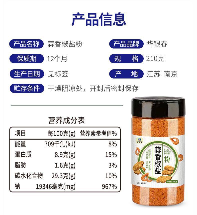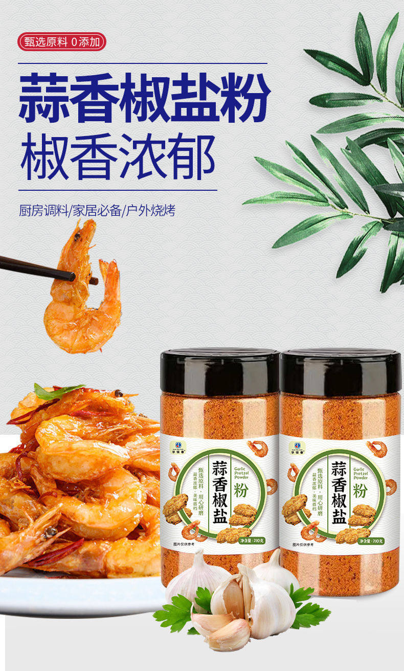 | Packaging specifications | Garlic pepper salt powder 210gx1 bottle,Garlic pepper salt powder 210gx2 bottles,Garlic pepper salt powder 210gx3 bottles,Garlic salt and pepper powder 210gx4 bottles,Garlic pepper salt powder 210gx5 bottles,Garlic pepper salt powder 210gx60 bottles,Five-spice salt and pepper powder 200gx1 bottle,Five-spice salt and pepper powder 200gx2 bottles,Spiced salt and pepper powder 200gx3 bottles,Five-spice salt and pepper powder 200gx4 bottles,Five-spice salt and pepper powder 200gx5 bottles,[two flavors] five-spice salt and pepper × 1 + garlic salt and pepper × 1 |