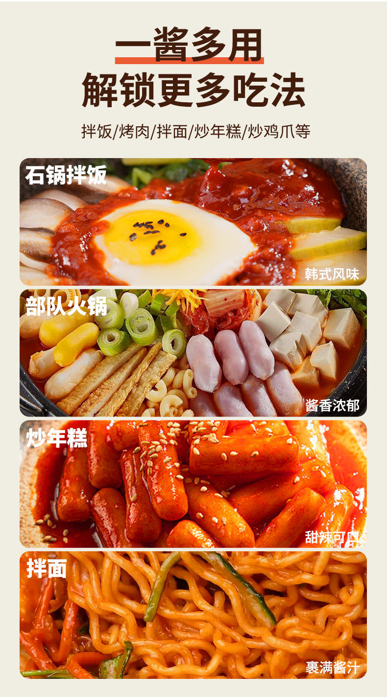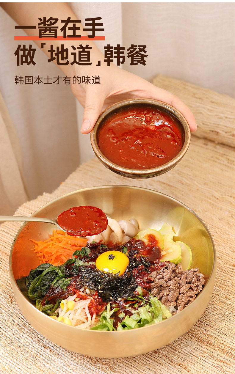 | Packaging specifications | [classic slightly spicy] 1 bottle of bibimbap sauce,[store manager recommendation] 1 bottle of classic slightly spicy bibimbap sauce + 5 bags of 10 grams of crushed seaweed,[2 bottles of great value] 1 bottle of classic slightly spicy + 1 bottle of non-spicy bibimbap sauce,[repurchase] 2 bottles of classic slightly spicy bibimbap sauce,[children can eat non-spicy version] 1 bottle of non-spicy bibimbap sauce,[children can eat non-spicy set] 1 bottle of non-spicy bibimbap sauce + 5 bags of 10 grams of crushed seaweed,[korean bibimbap combination] 1 bottle of bibimbap sauce + 1 bag of 70 grams of seaweed,Stone pot bibimbap sauce 1000g (commercial bagged) |