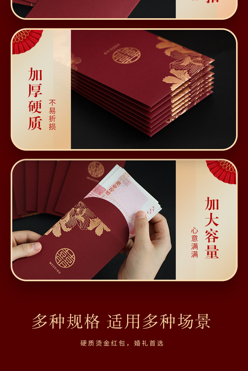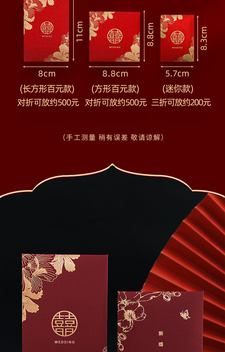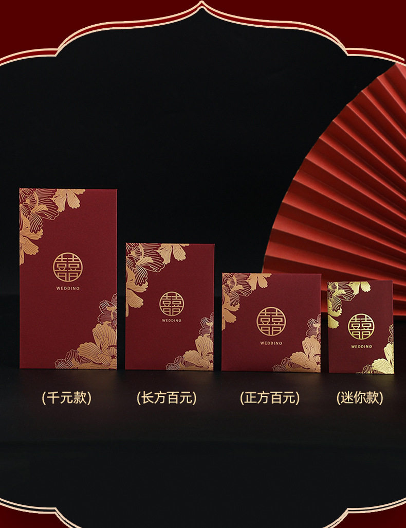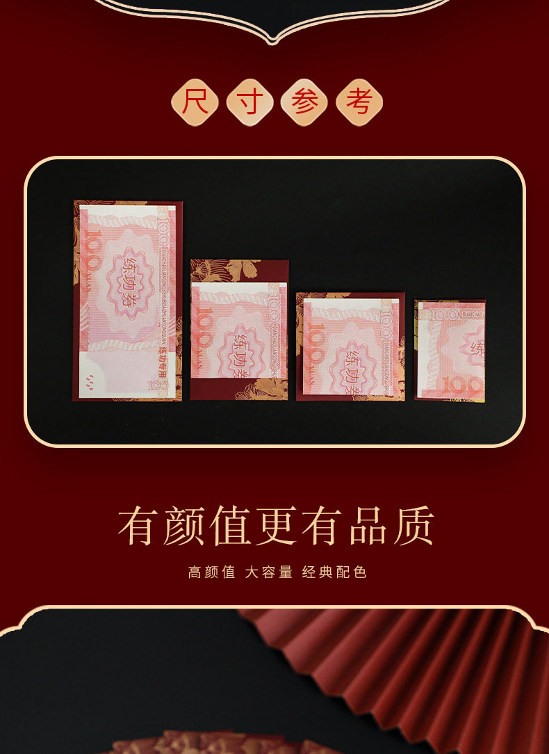 Size [50] mini red envelopes (2 yuan/5 yuan/10 yuan in half),[10] Square 100 yuan (within 500 yuan in half),[10] rectangular 100 yuan (fold it in half and put it within 500 yuan),[10] thousand yuan red envelope (tile within 2,000 yuan)