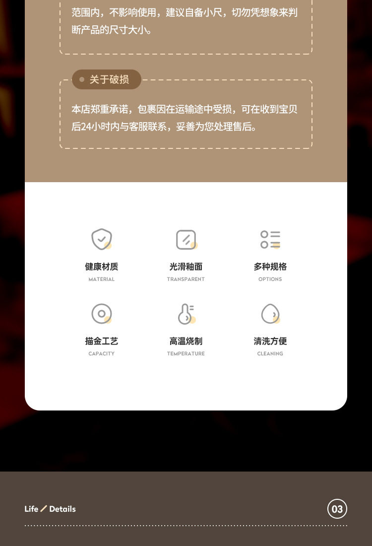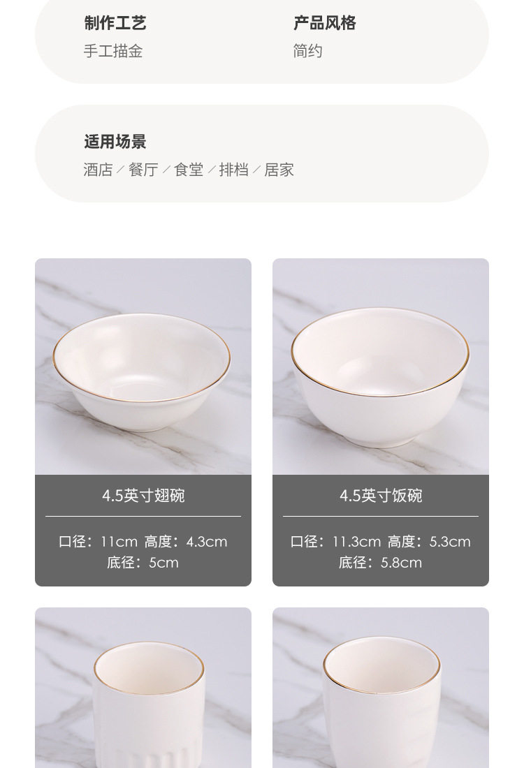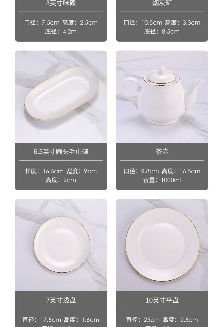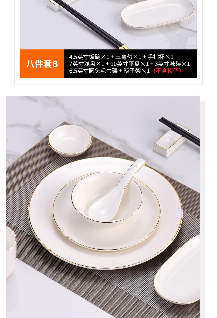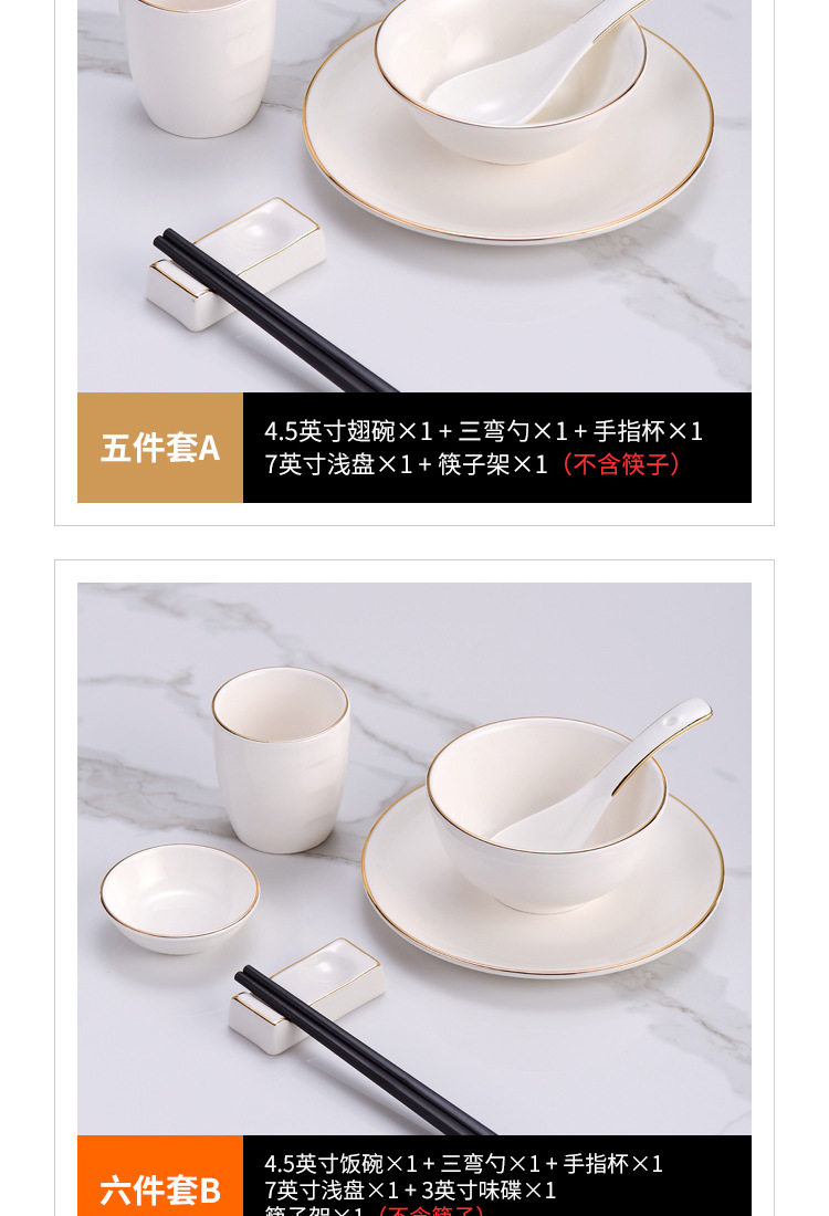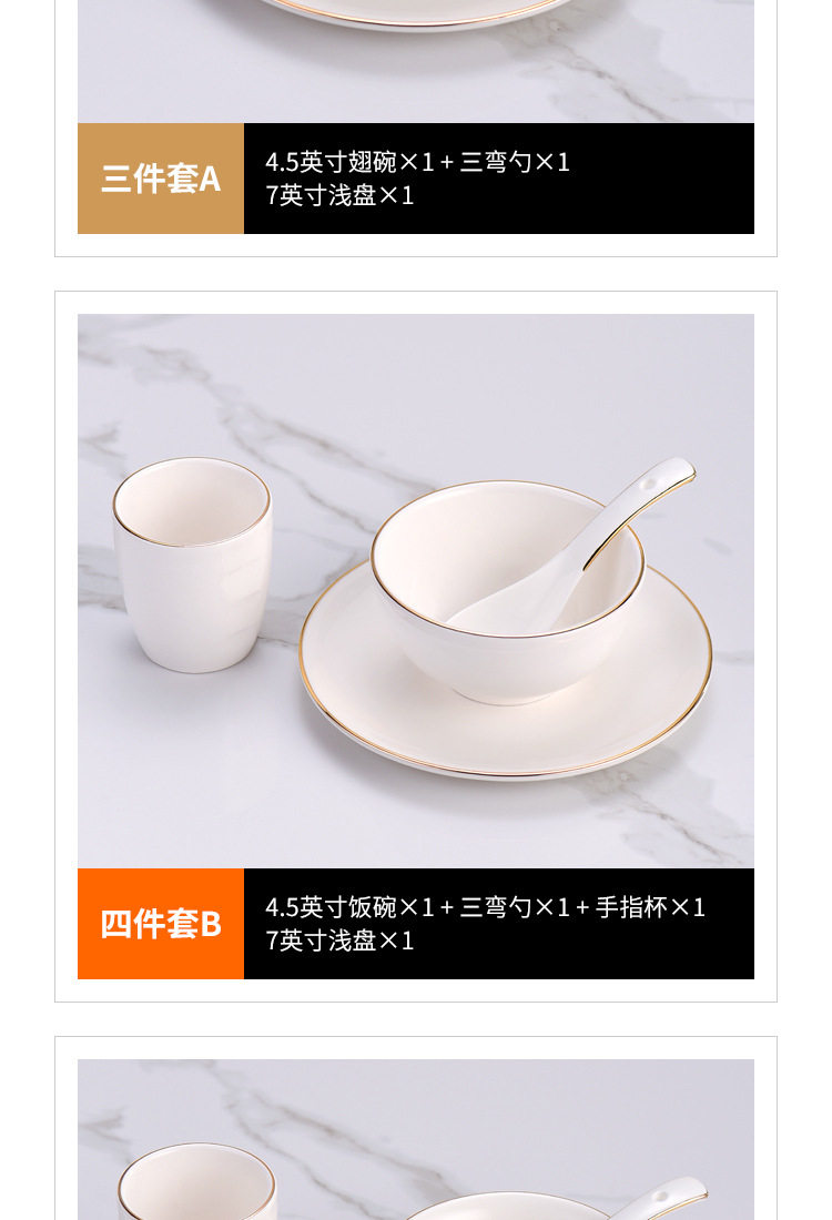 | Color | Phnom Penh three-piece set Model A,Golden edge three-piece set Model B,Golden edge four-piece set Model A,Golden edge four-piece set Model B,Golden edge five-piece set Model A,Golden edge five-piece set B style,Phnom Penh six-piece set Model A,Golden edge six-piece set Model B,Golden edge seven-piece set Model A,Golden edge seven-piece set B style,Golden Edge eight-piece set Model A,Golden Edge eight-piece set B style,Phnom Penh 4.5-inch Wing Bowl,Phnom Penh 4.5-inch Rice Bowl,Golden Edge 7-inch shallow plate,Phnom Penh three-bend spoon,Phnom Penh finger Cup,Golden edge half grain Cup,Golden edge chopsticks rack,Phnom Penh 3-inch flavor dish,Phnom Penh 10-inch flat plate,Phnom Penh 6.5 inch round head towel dish,Phnom Penh 4-inch ashtray,Phnom Penh toothpick holder,Phnom Penh teapot,Jin Fu chopsticks 10 pairs |