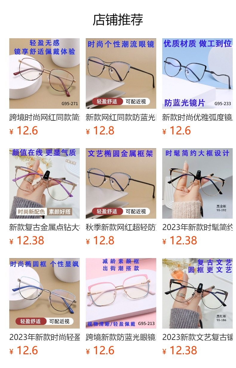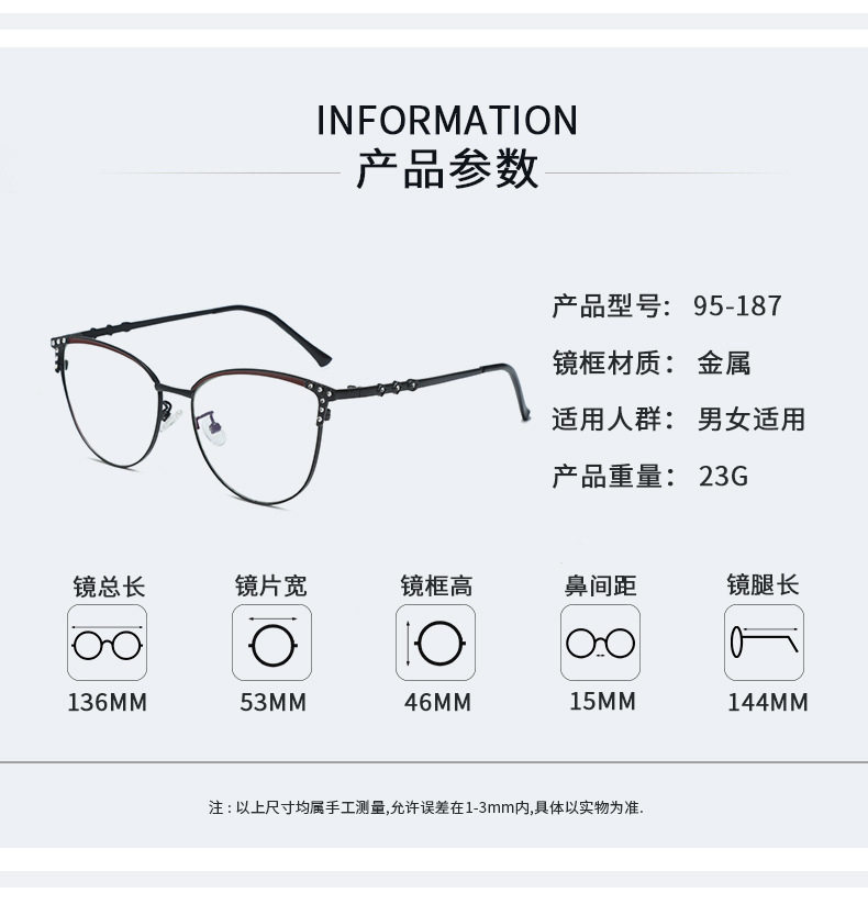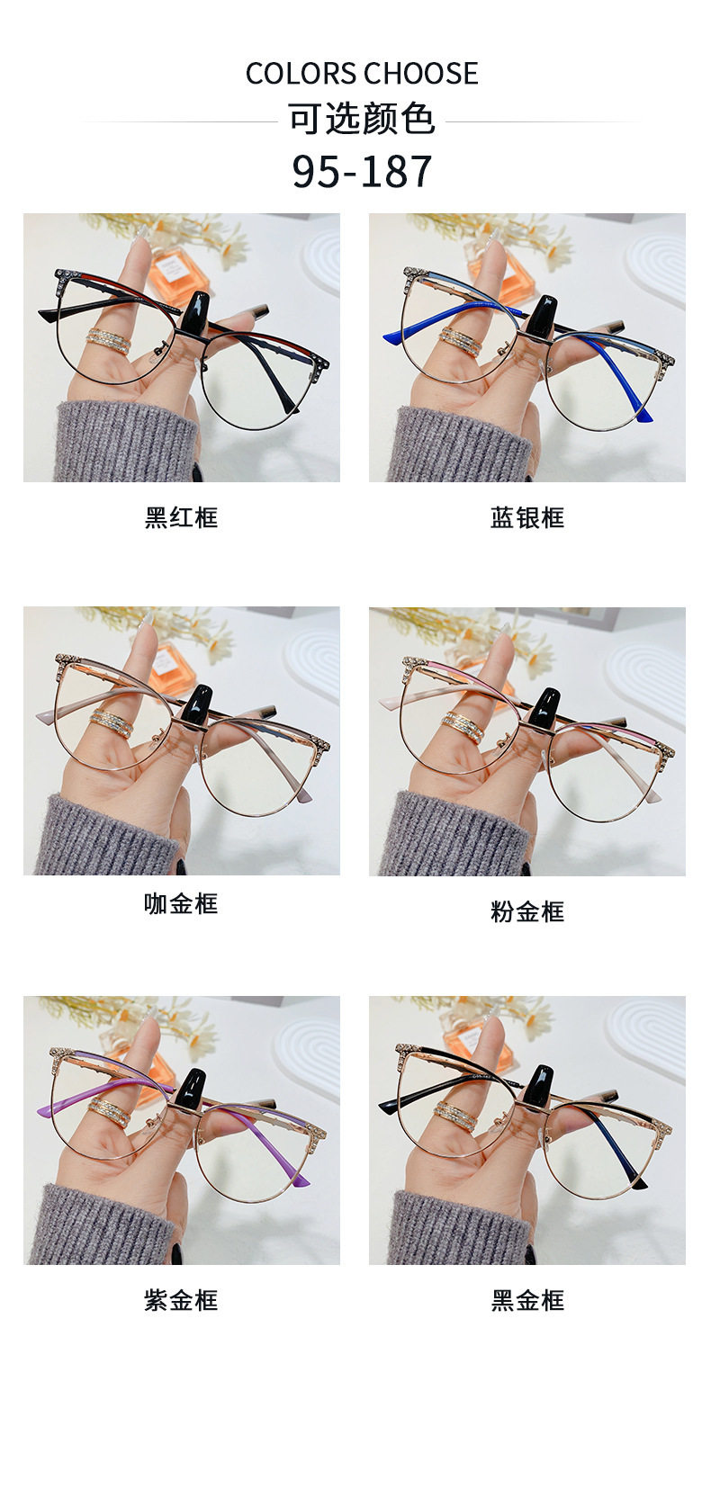 | Frame color | Pink gold frame-95187,Purple gold frame-95187,Black gold frame-95187,Coffee gold frame-95187,Blue silver frame-95187,Black and red frame-95187 |